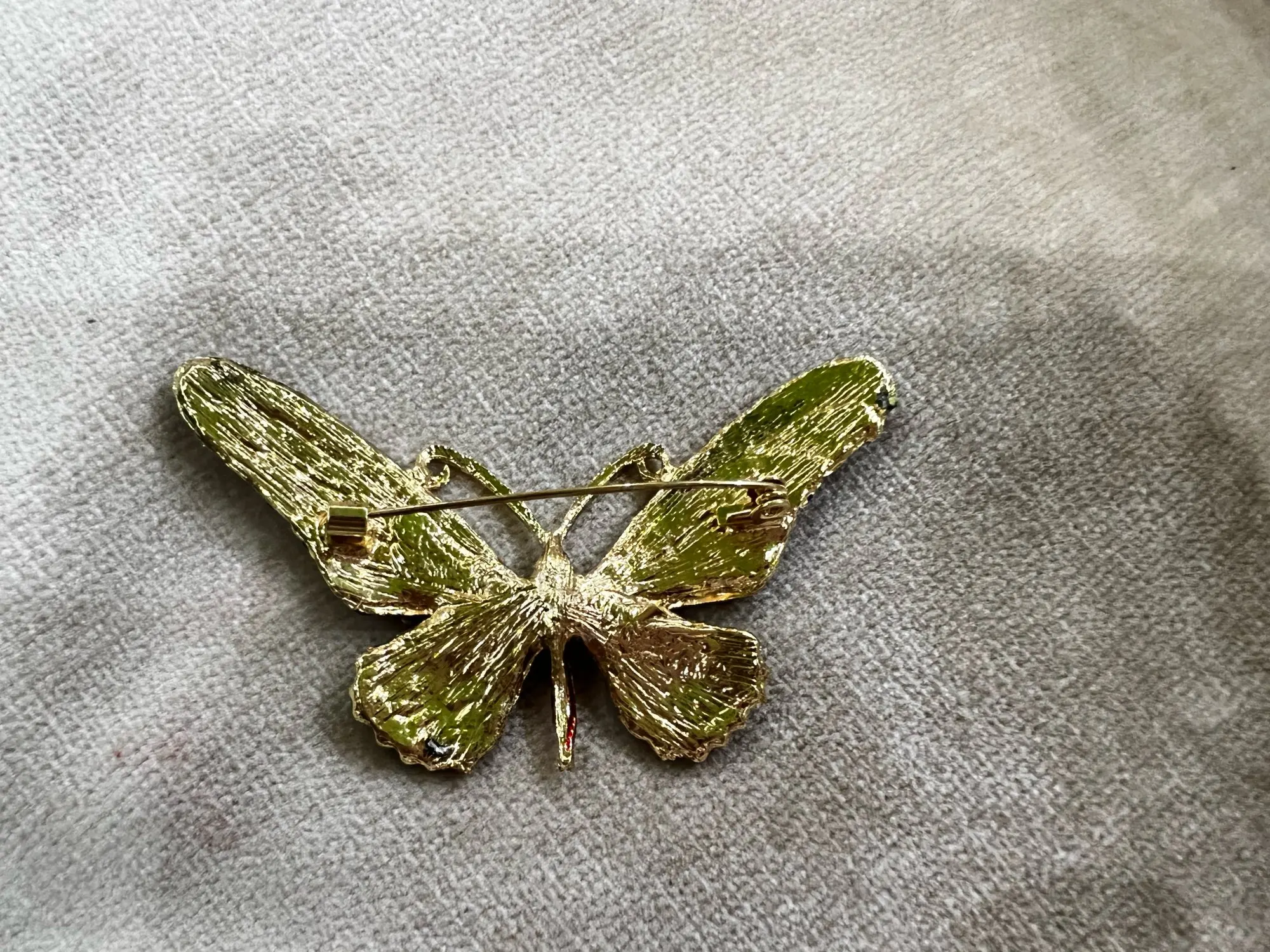 It is exactly like on the picture. It's heavy, has a nice pin and shines really beautifully.