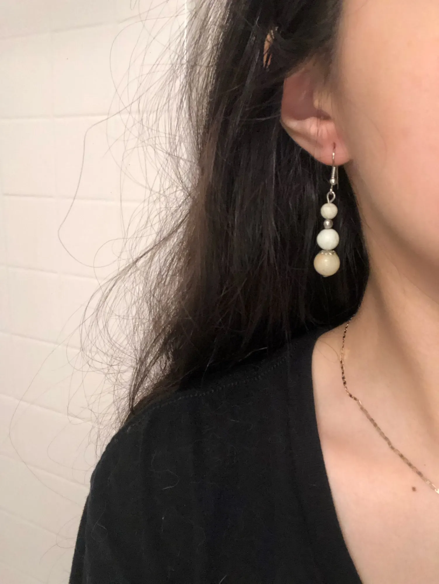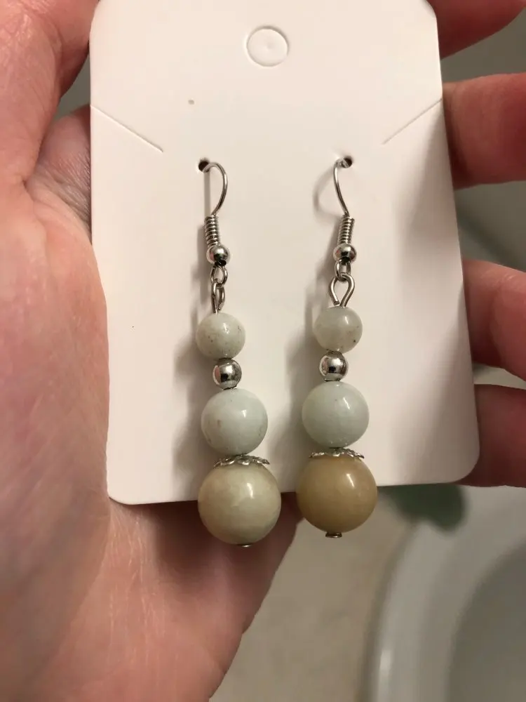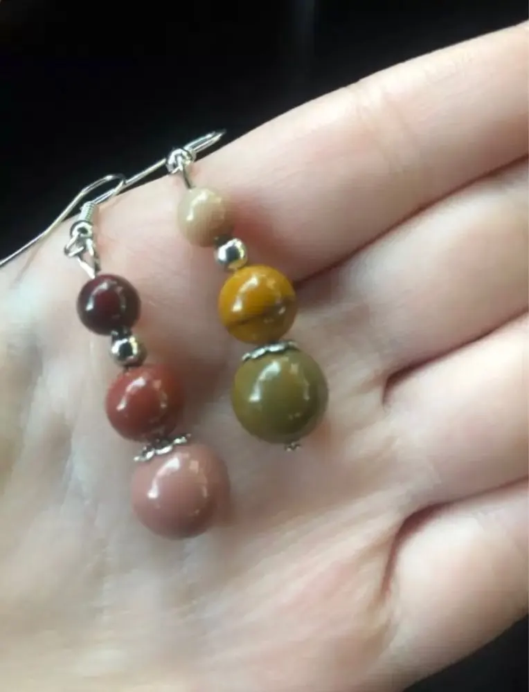 Earring pairs don’t match, in the picture the earrings are the same color. And they look wood. However the product is stone which is ok.