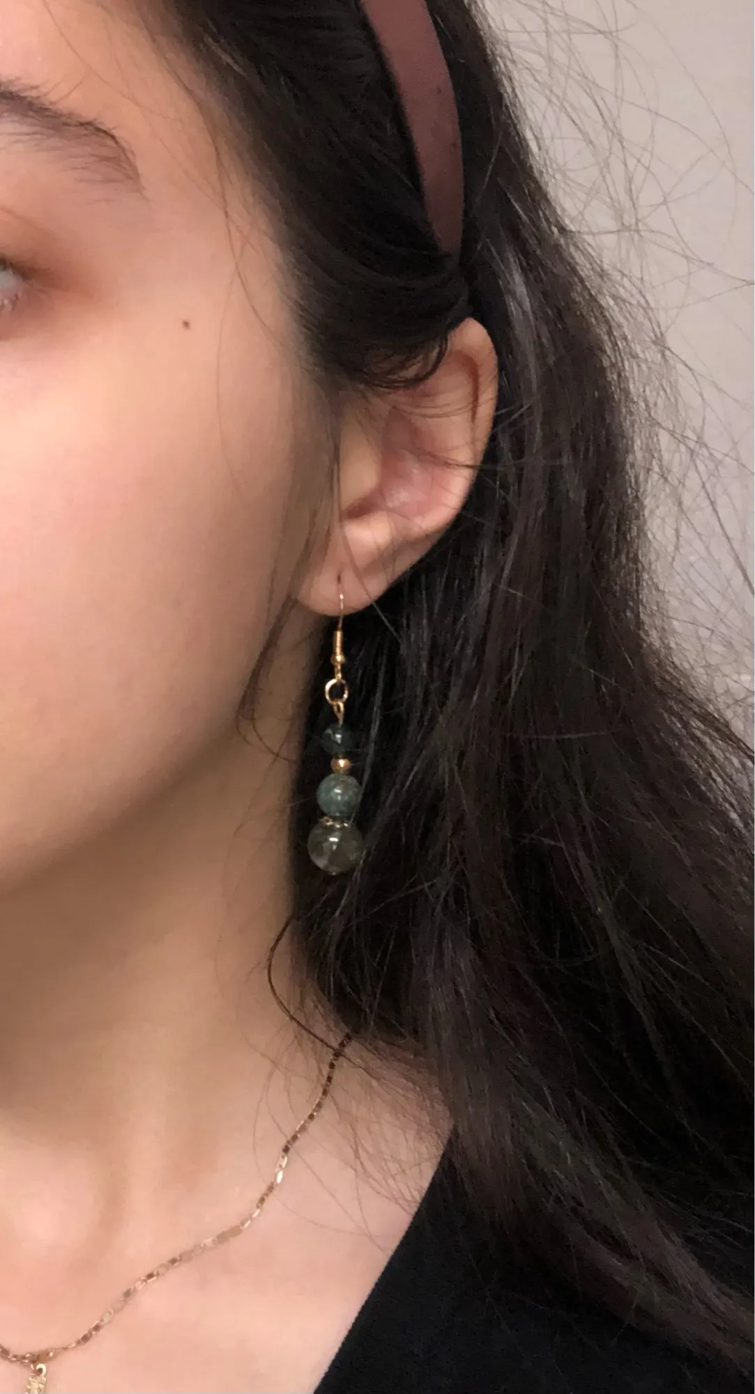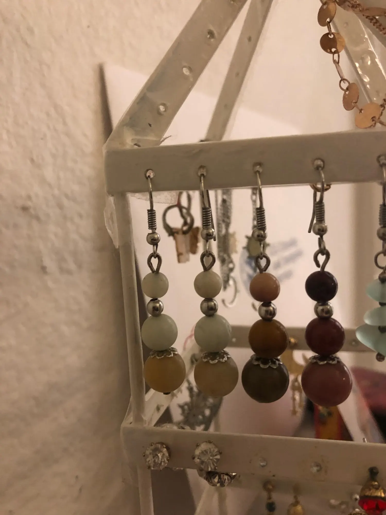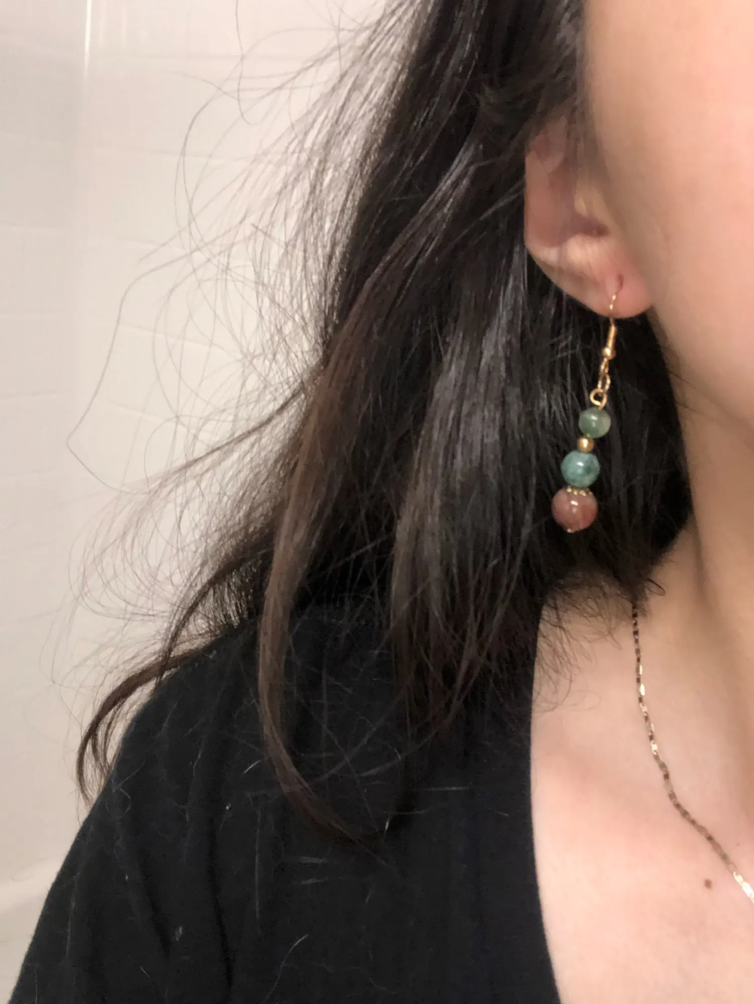 Earring pairs don’t match, in the picture the earrings are the same color. And they look wood. However the product is stone which is ok.