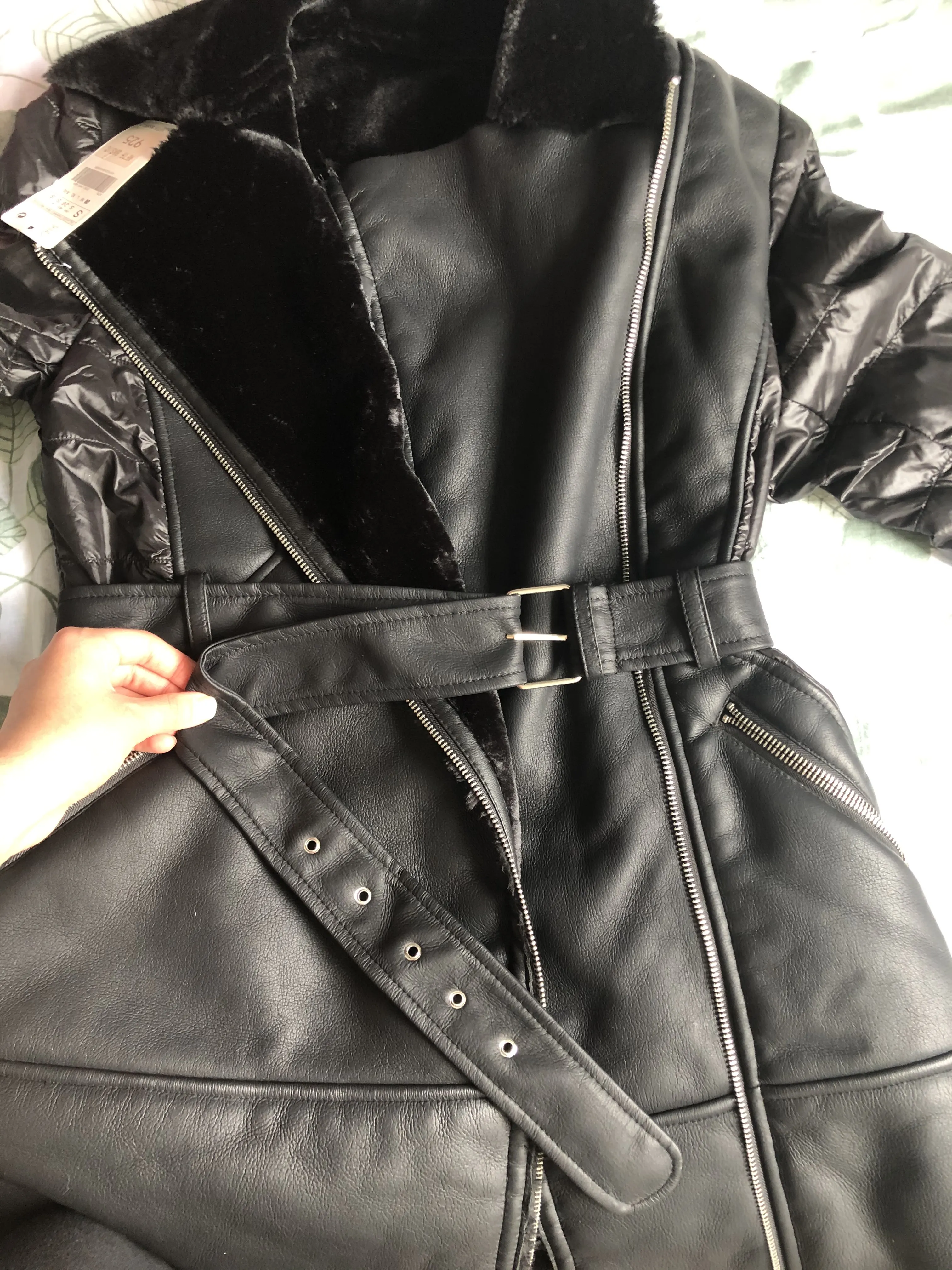 Fitaylor New Winter Women Patchwork Lamb Fur Overcoat Turndown Collar Zipper Motorcycle Outwear Faux Soft Leather Long Jacket