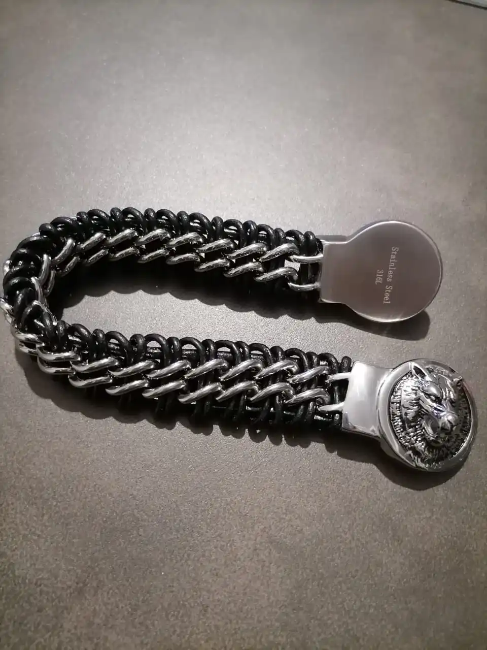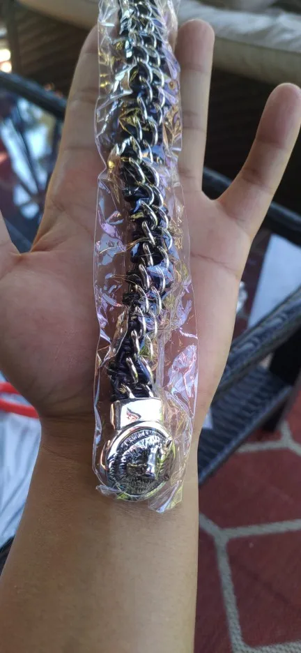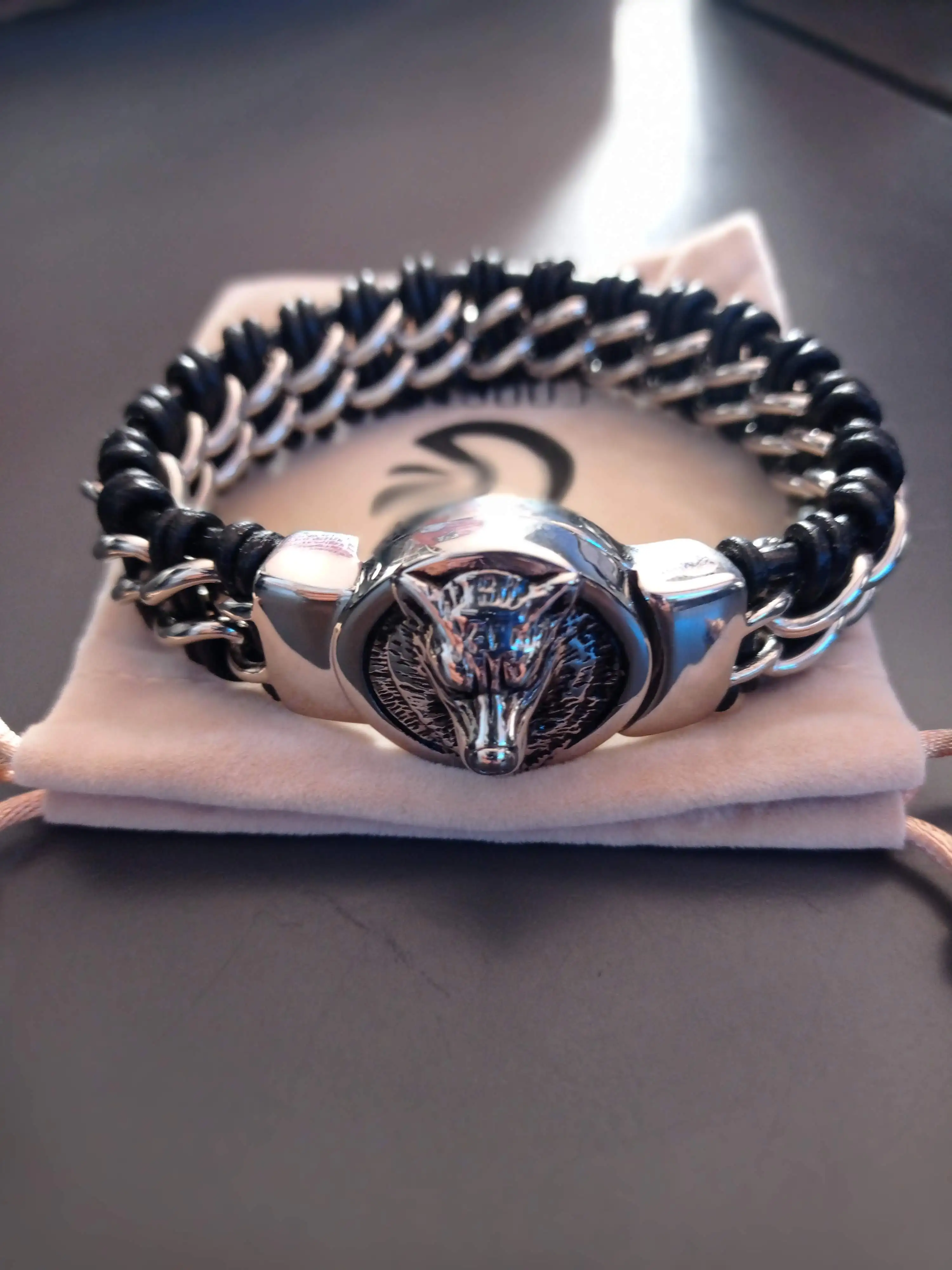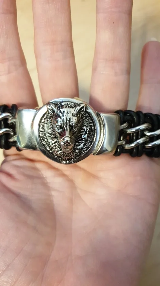 Fongten Antique Teen Wolf Head Charm Bracelet Braid Stainless Steel with Leather Rope Men's Bracelets Bangle Wristband Pulseira