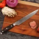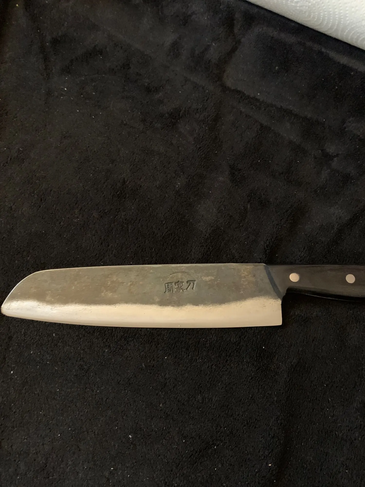 I cut myself after sharpening it on a 1000 grit Japanese stone. Some residue due to the black stuff, that normally comes off after washing the knife a little bit. Though would of liked the thickness to be a little bit less, but after using it for a day or two you get used to it. Over-all a nice purchase and would purchase another thinner knife for small game and fruit/vegies. Happy with the purchase. Left a nice clean cut on the hand.