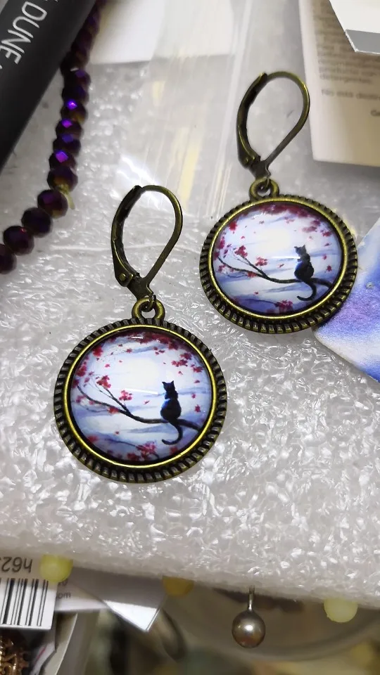 Glass Cute Cat Under The Night Sky Women Dangle Earrings Fashion Drop Earrings, New Kitten Glass Cabochon Lady Earrings Jewelry