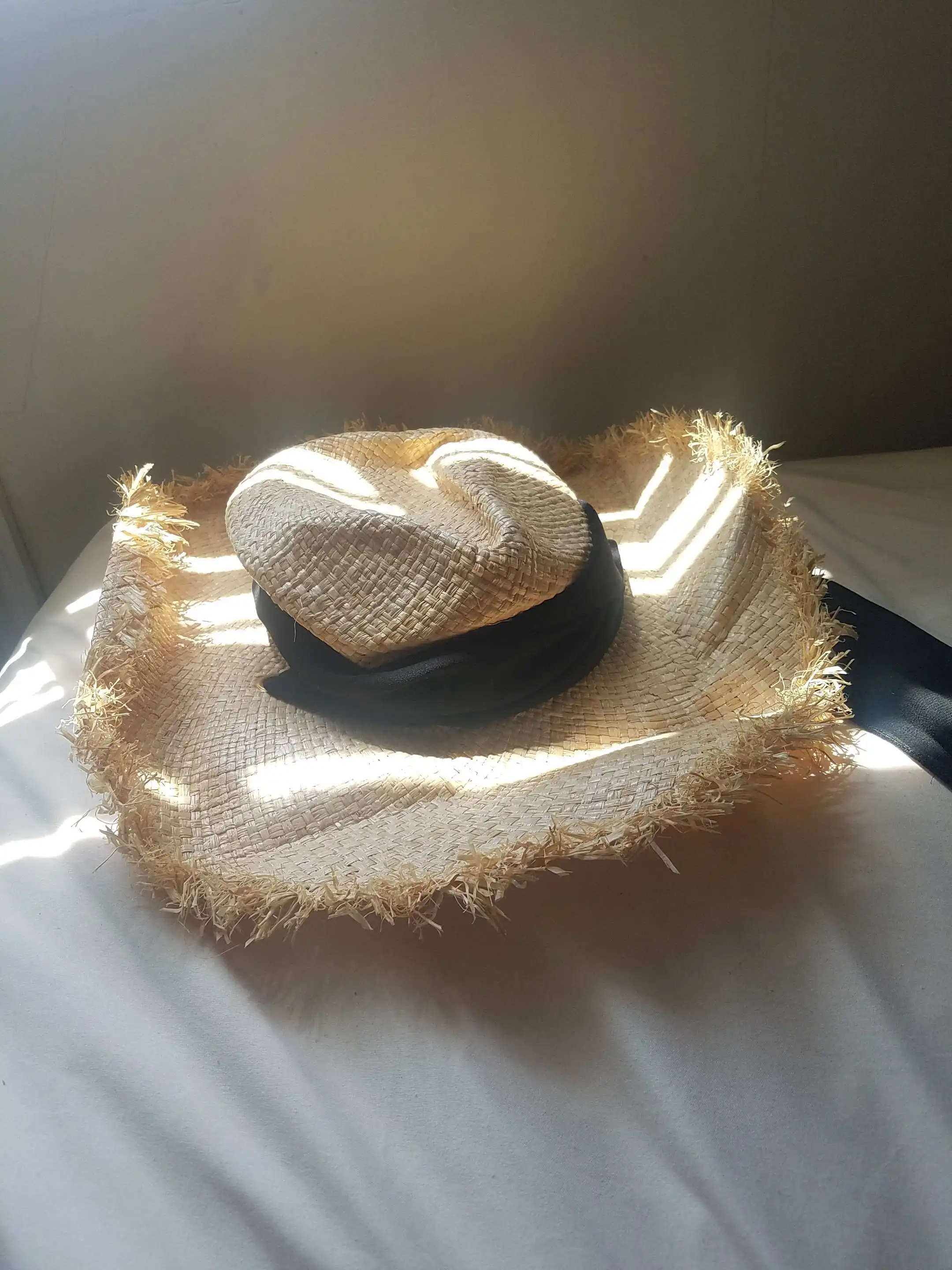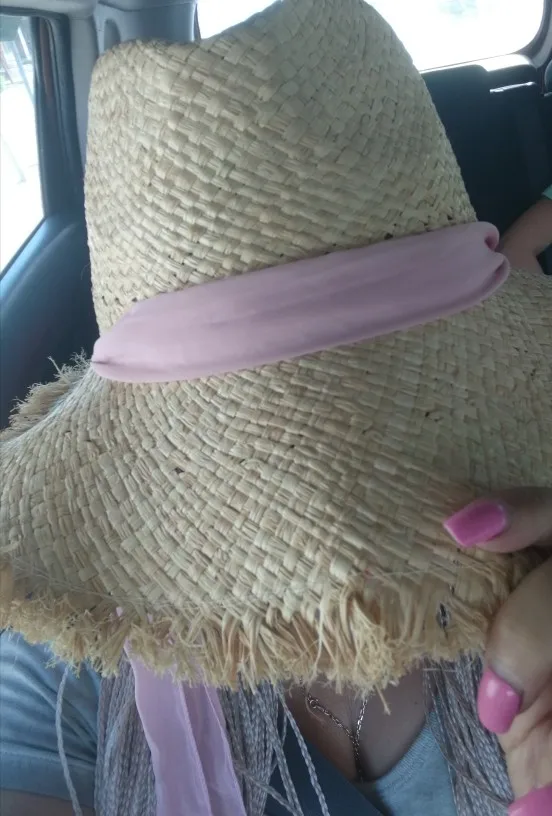 Handmade Weave 100%Raffia Sun Hats For Women Black Ribbon Lace Up Large Brim Straw Hat Outdoor Beach Summer Caps Chapeu Feminino