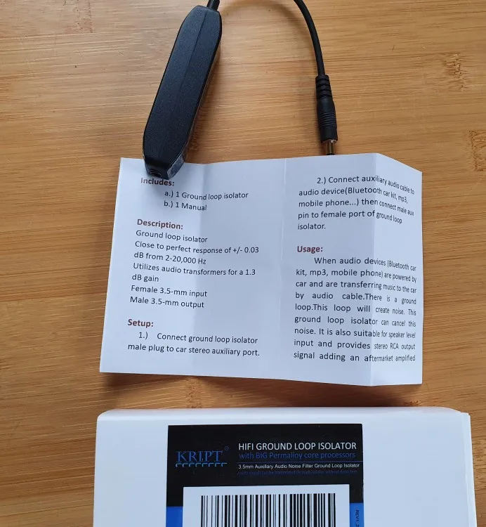 Excellent ground loop isolator. This is my 2nd order ! Very small device. Fast delivery. Thank You !