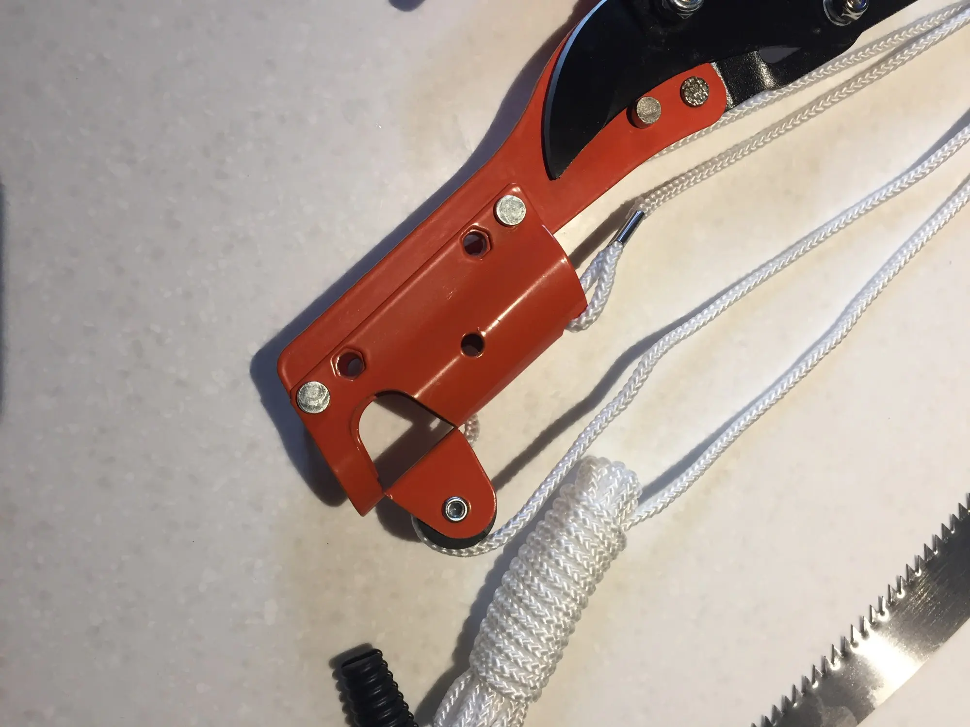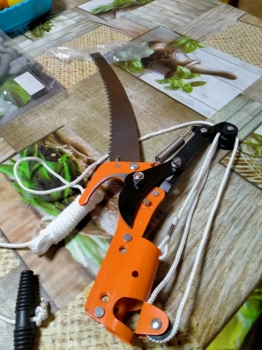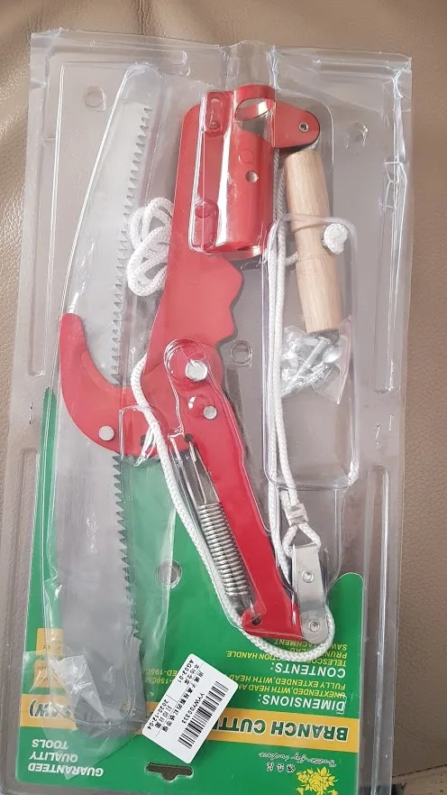 The product i received did not much the on which appears on the product page. It looks the same but it has only one Polly at the top of the machine instead of two. Also, the set of screws needed to attach this pruner were missing... However, I tested this pruner on my trees and it does the job.