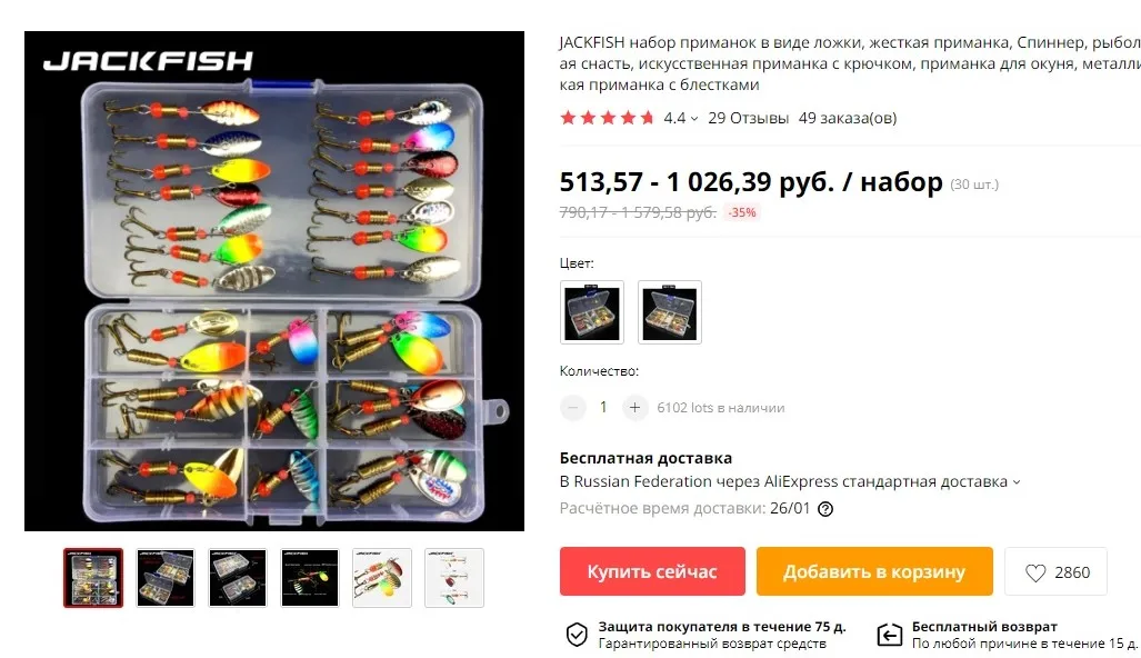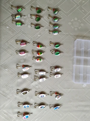 All of the spinners have glued stickers, while in the advertisement photos there are almost no spinners with stickers. In the seller photos, there are also: different shapes of the blade; different surface shaping - wavy, or imitating fish scales; none of the received spinners are such. There are also many duplicates (up to 4 with the same color; only 7 spinners have a non-repeated color). In total there are 16 types of coloring in the 30-unit set. I had ordered the set because of the variety shown in the seller photos and because there were almost no spinners with glued stickers in those photos.