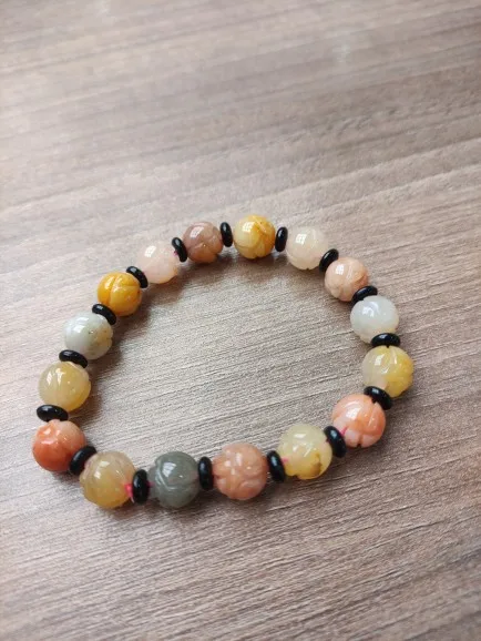 JD Handmade Tibetan Buddhist Thread Lucky Bracelet 10mm Natural Gold Jade Beads Carved Flower OM Mani Padme Hum Bangle