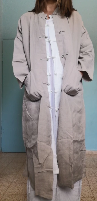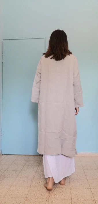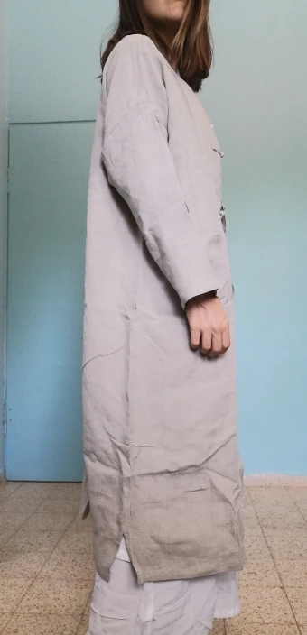 Wow, it's nice. The cotton is a tad bit thicker and heavier, and large (enough to make it an outer layer like a jacket.) It fit wonderfully ans looks good with any outfit underneath. (55kg, 163cm)