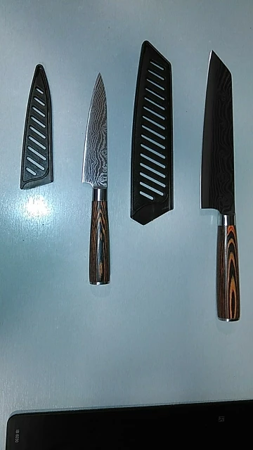Shipping (time to product delivery) was faster than most other sellers I've dealt with, which was appreciated. Nice looking knives; no it isn't real Damascus but the item description, at least in English, reads "Imitation Damascus" so you shouldn't be surprised. Knives were either very sharp as shipped or could be easily touched up with stone and steel, providing decent value for the money. I'll probably buy a few more.
