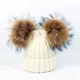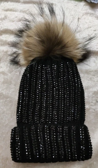 KNB013 Removable Winter Warm Fur Pom pom Knitted Hats Women Handmade Striped Rhinestone Bones Skullies Beanie With 15cm Fur Ball