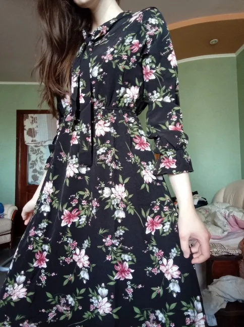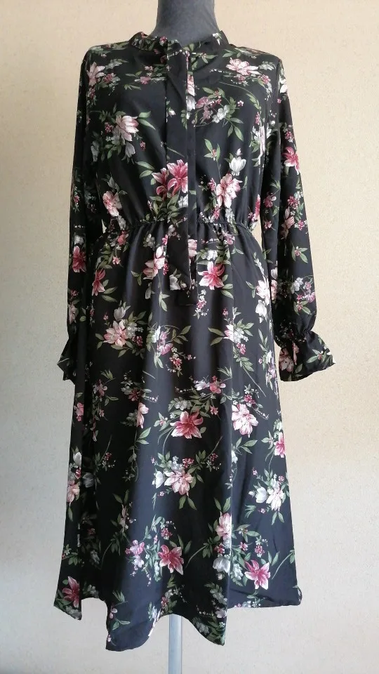 Korean Chiffon Spring Summer Dress Women Long Sleeve Vintage Floral Printed Autumn Bow Elastic Waist Midi Sundress Slim Vestidos