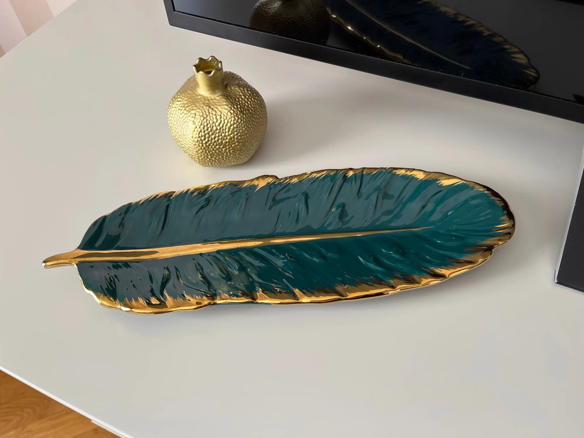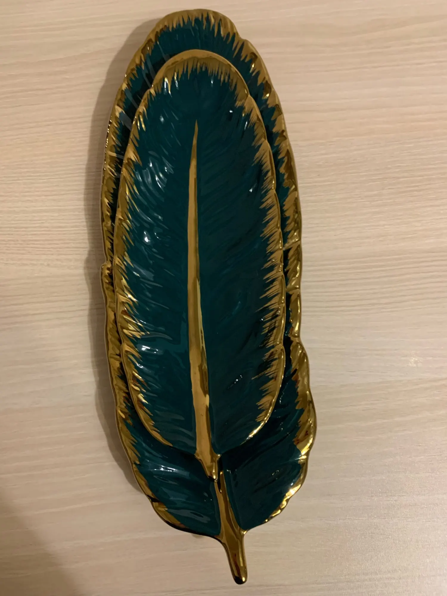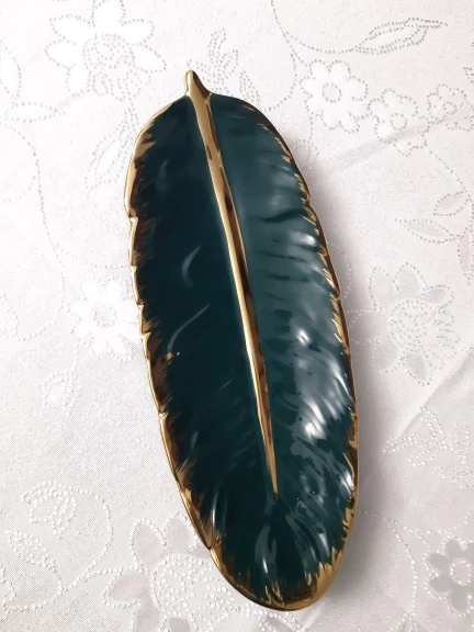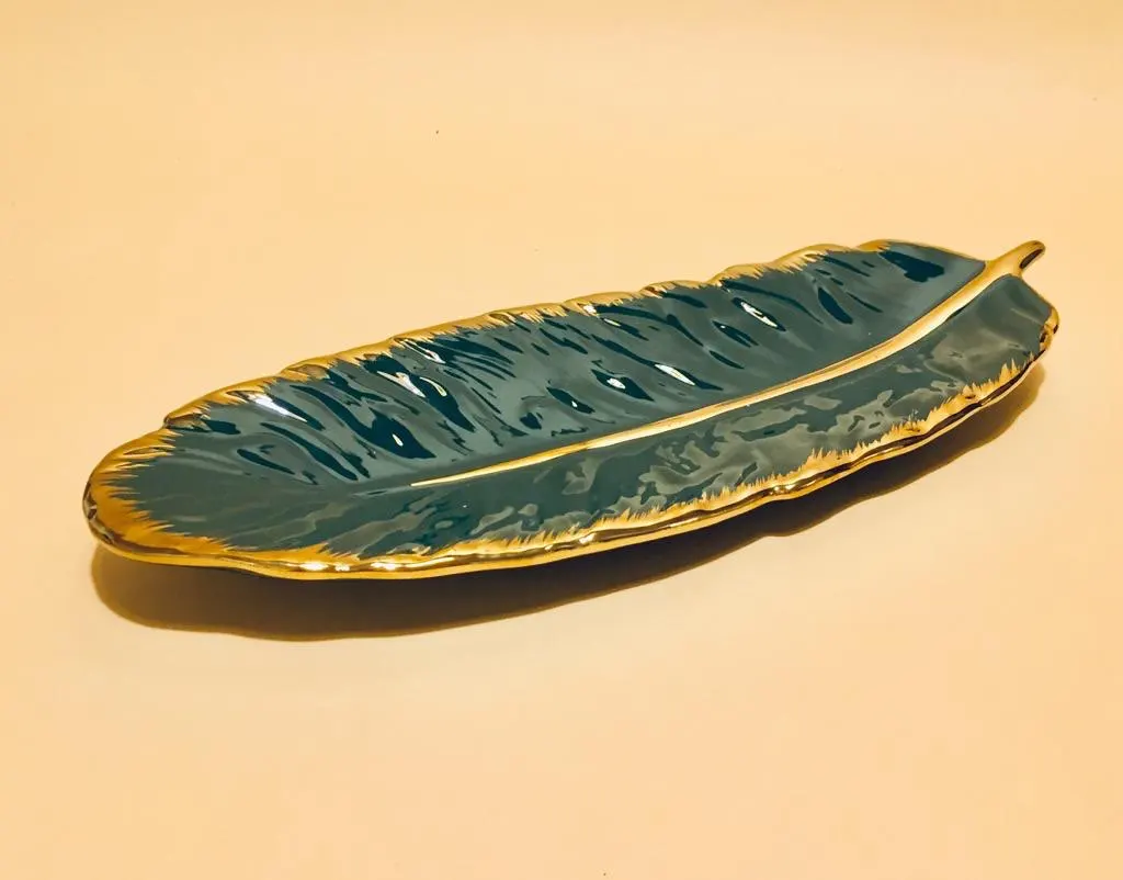 Luxury Ceramic Platter Storage Tray with Glod Rim Green Leaf Glod Feather Jewelry Makeup Brush Storage Decorative Sushi Plate