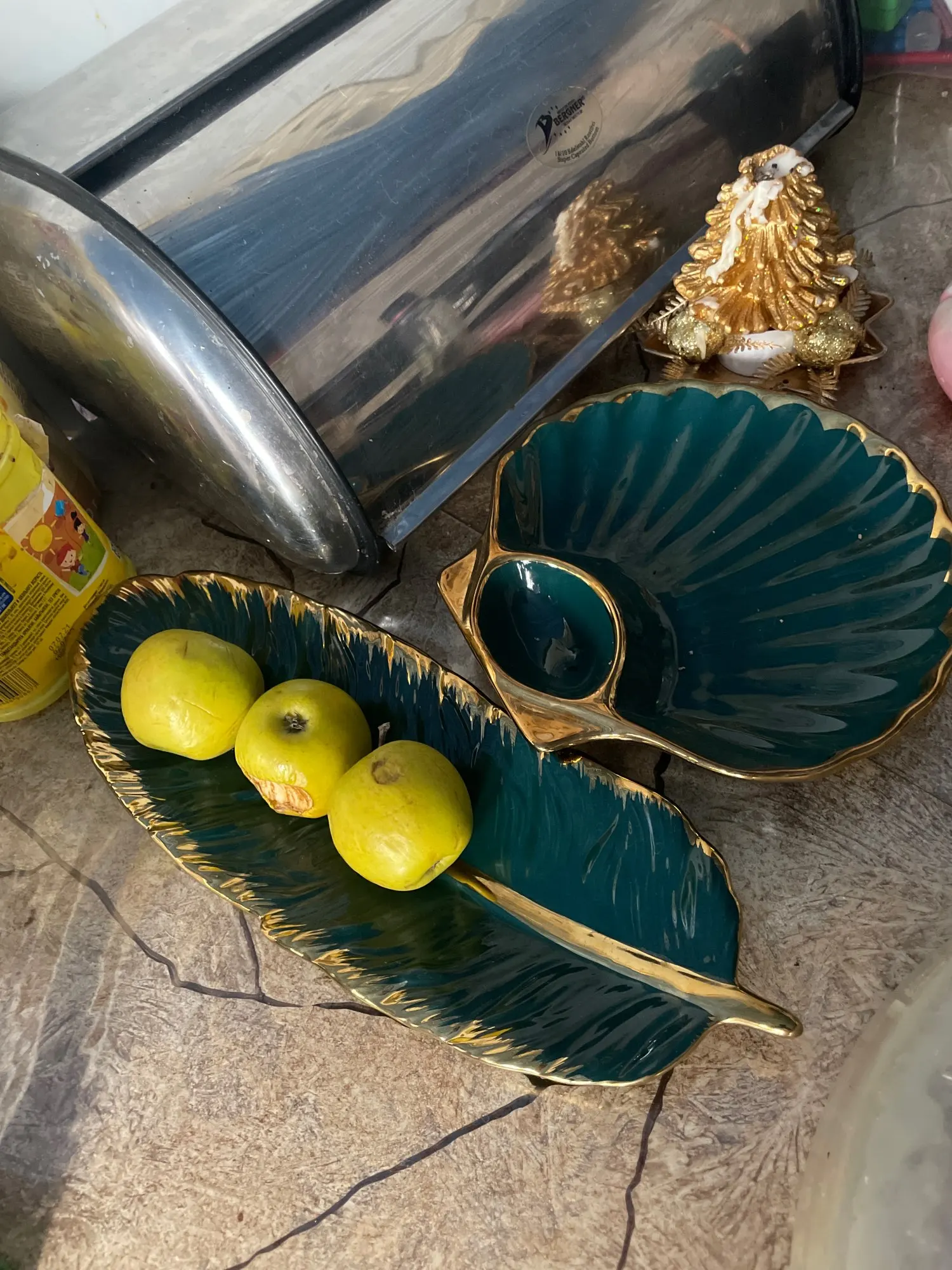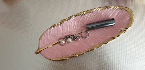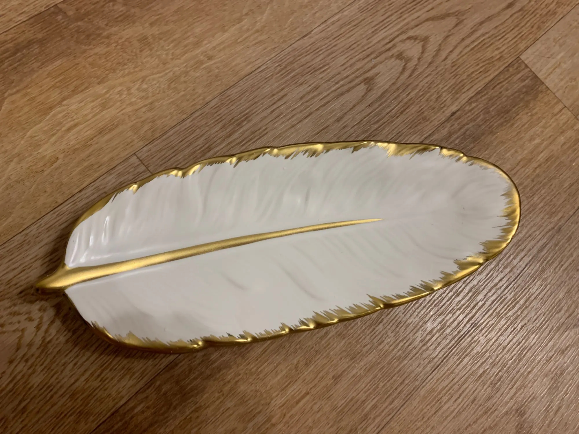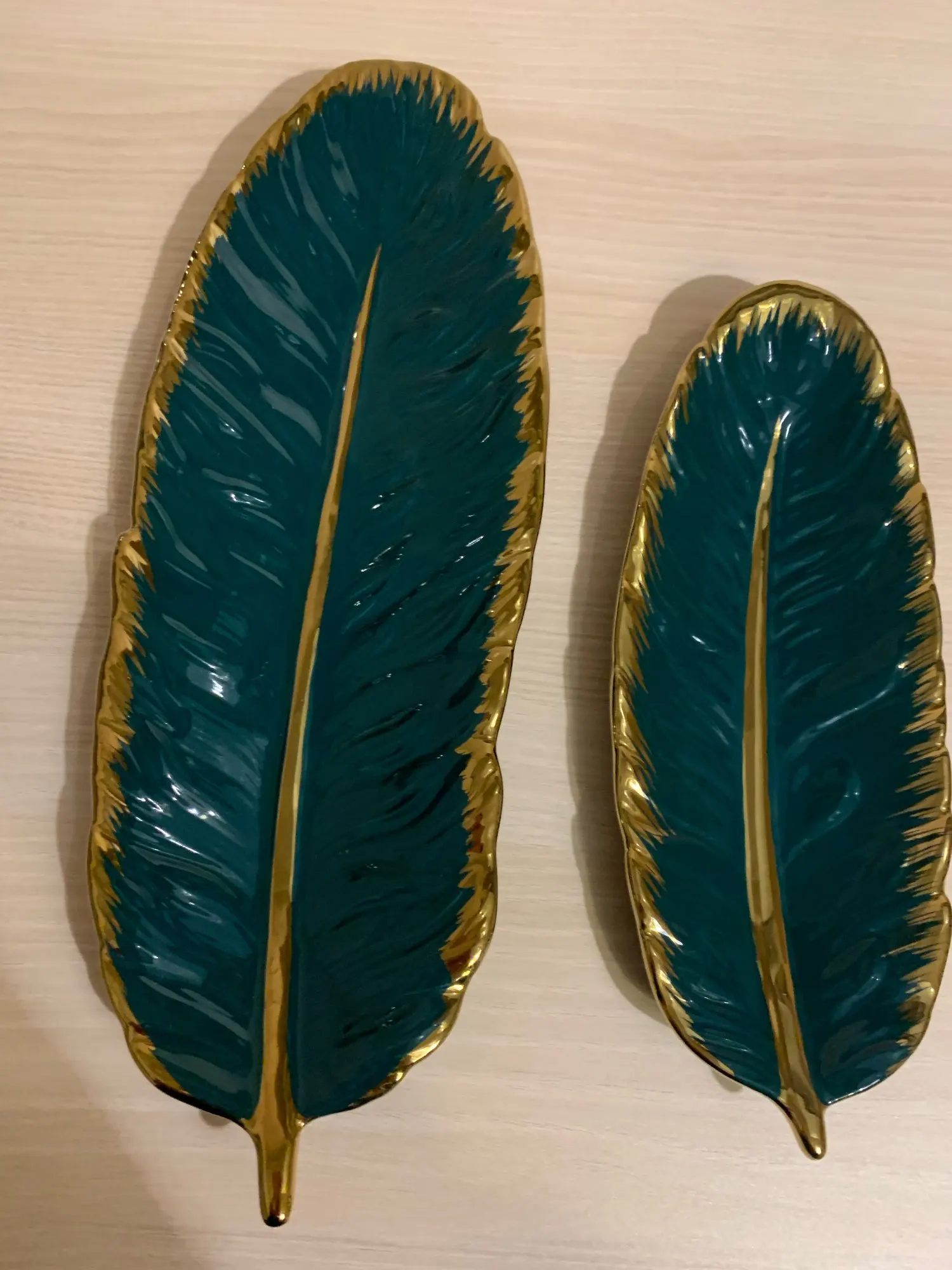 Luxury Ceramic Platter Storage Tray with Glod Rim Green Leaf Glod Feather Jewelry Makeup Brush Storage Decorative Sushi Plate