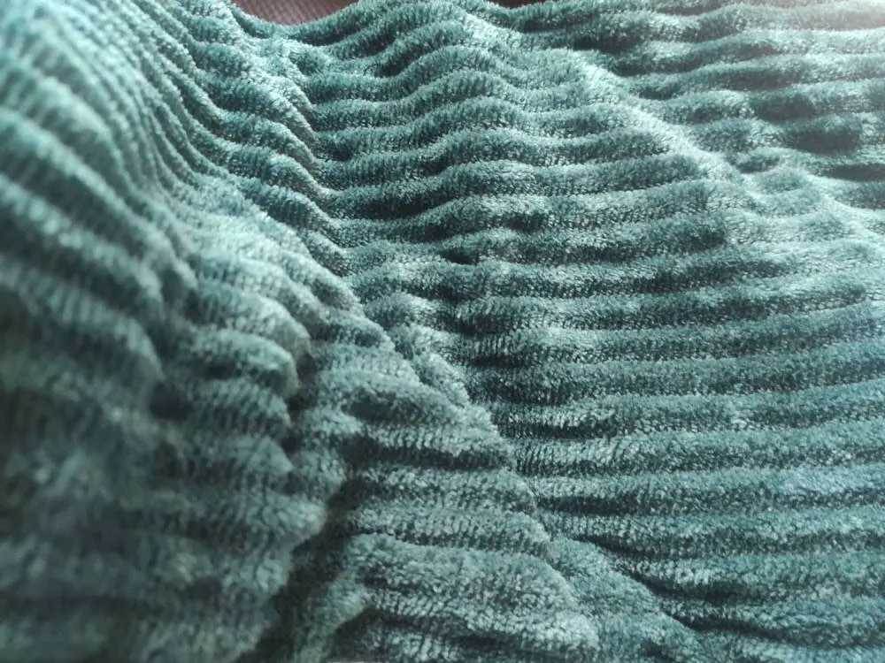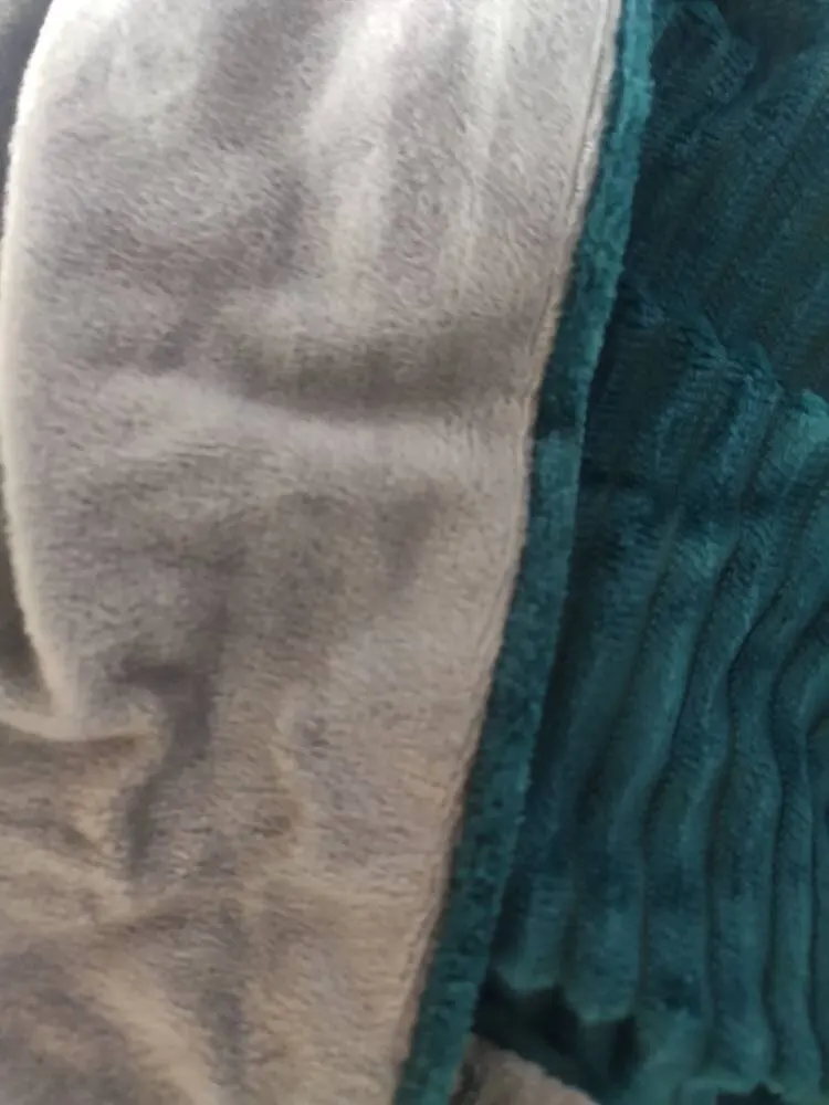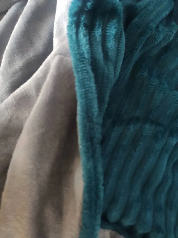 The picture shows green on one side and grey on the other side. Arrived green both sides. The fabric feels nice and soft but surprisingly thin. So the description is not accurate. The size is good. The sleep is plesent.