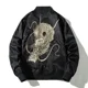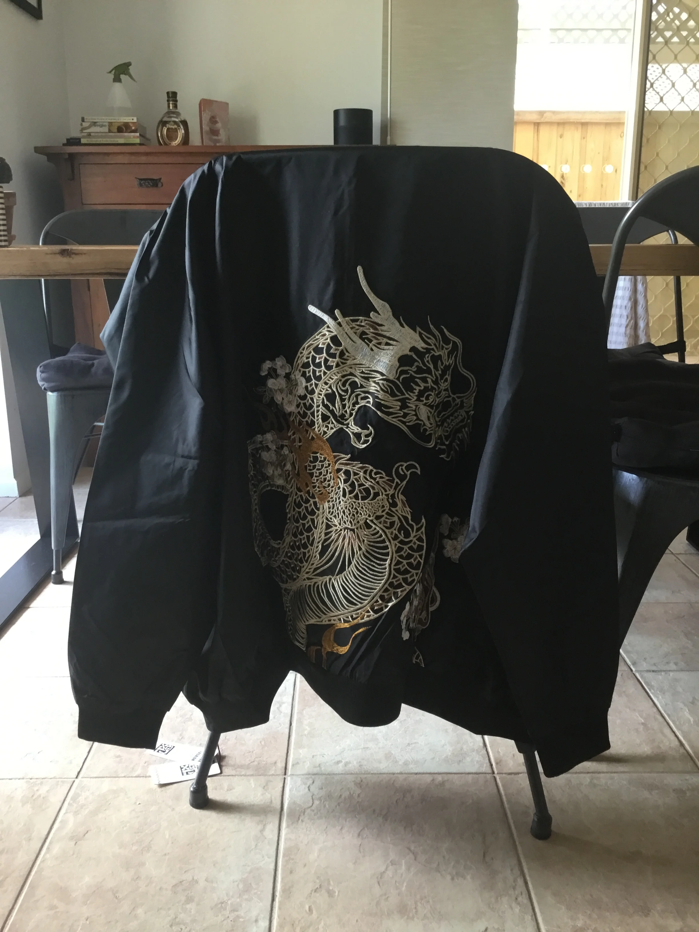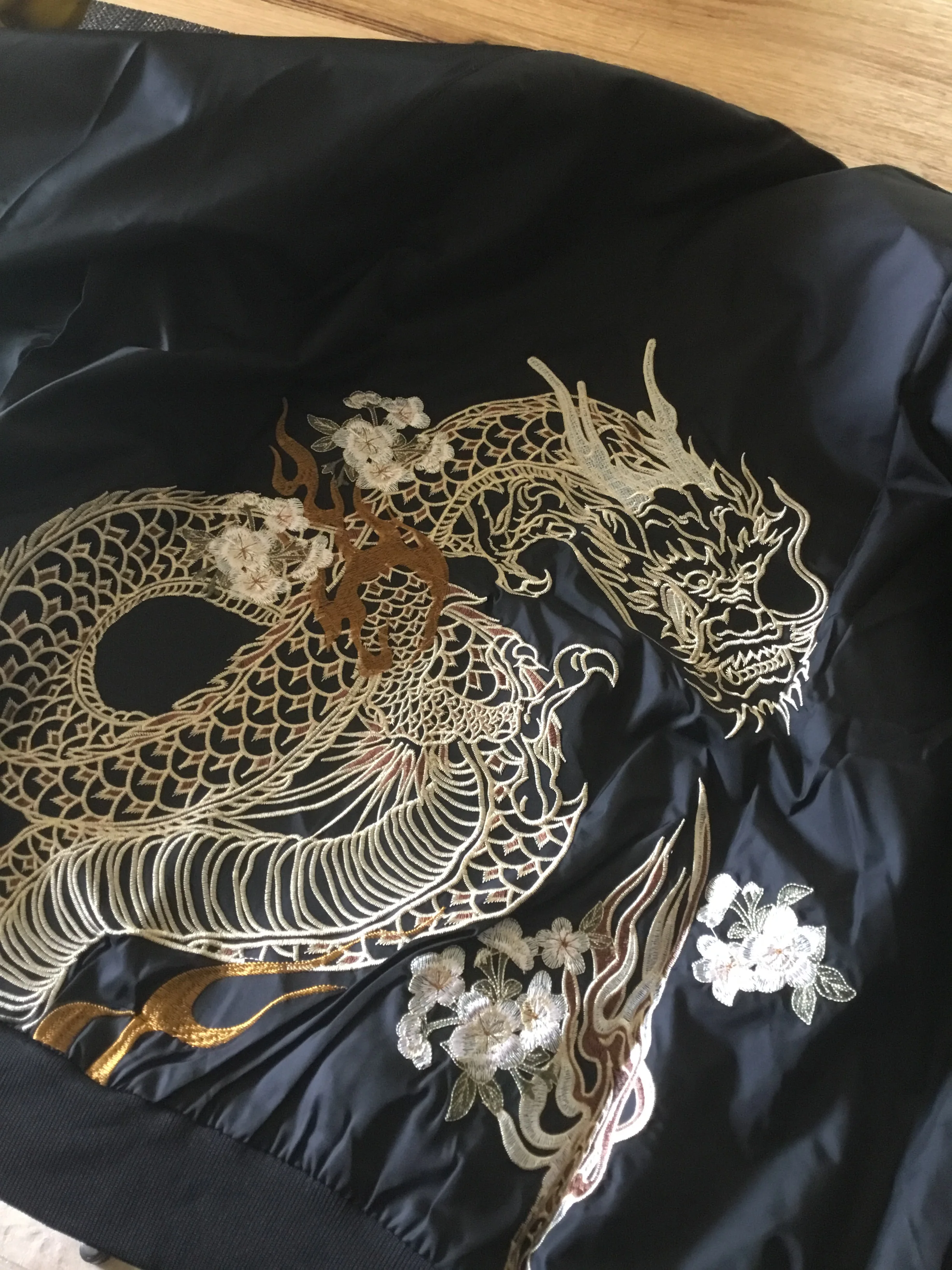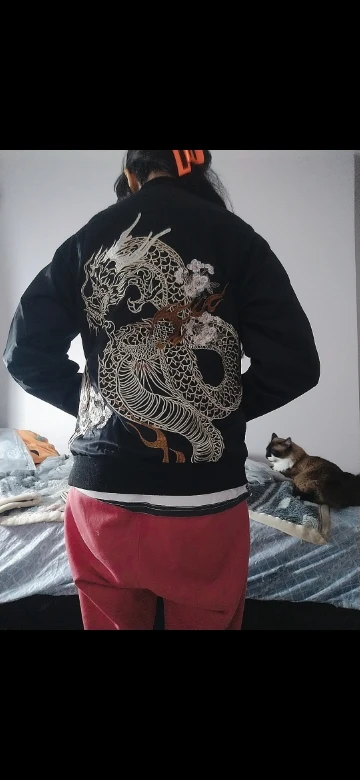Jacket embroidery is great quality. Jacket is made of spray jacket material. 3XL is about the same as a standard western sized XXL.