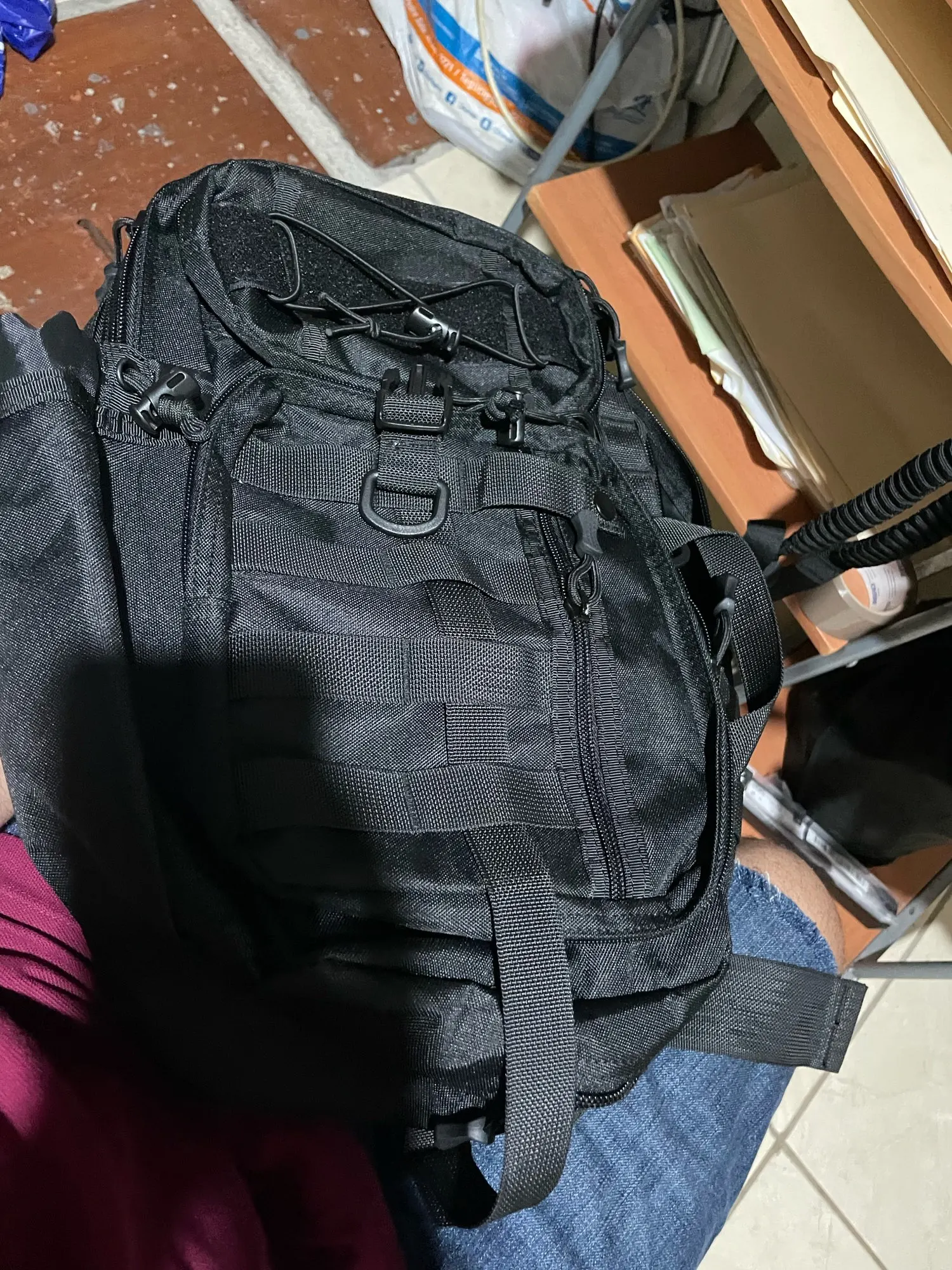 Perfect. Haven't used it yet, but looks comfortable and feels solid. Big enough for a laptop and other stuff, with different size compartments. Big enough for large water bottle. Would recommend!