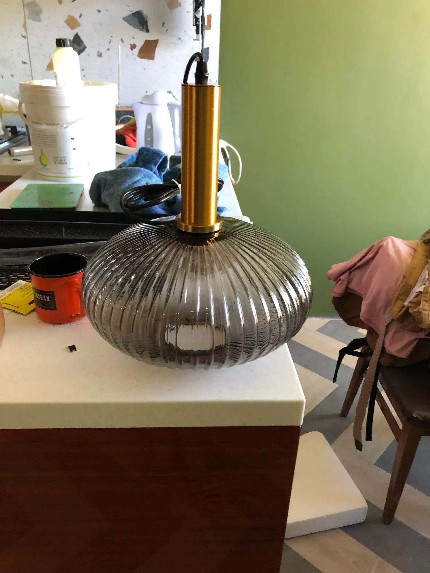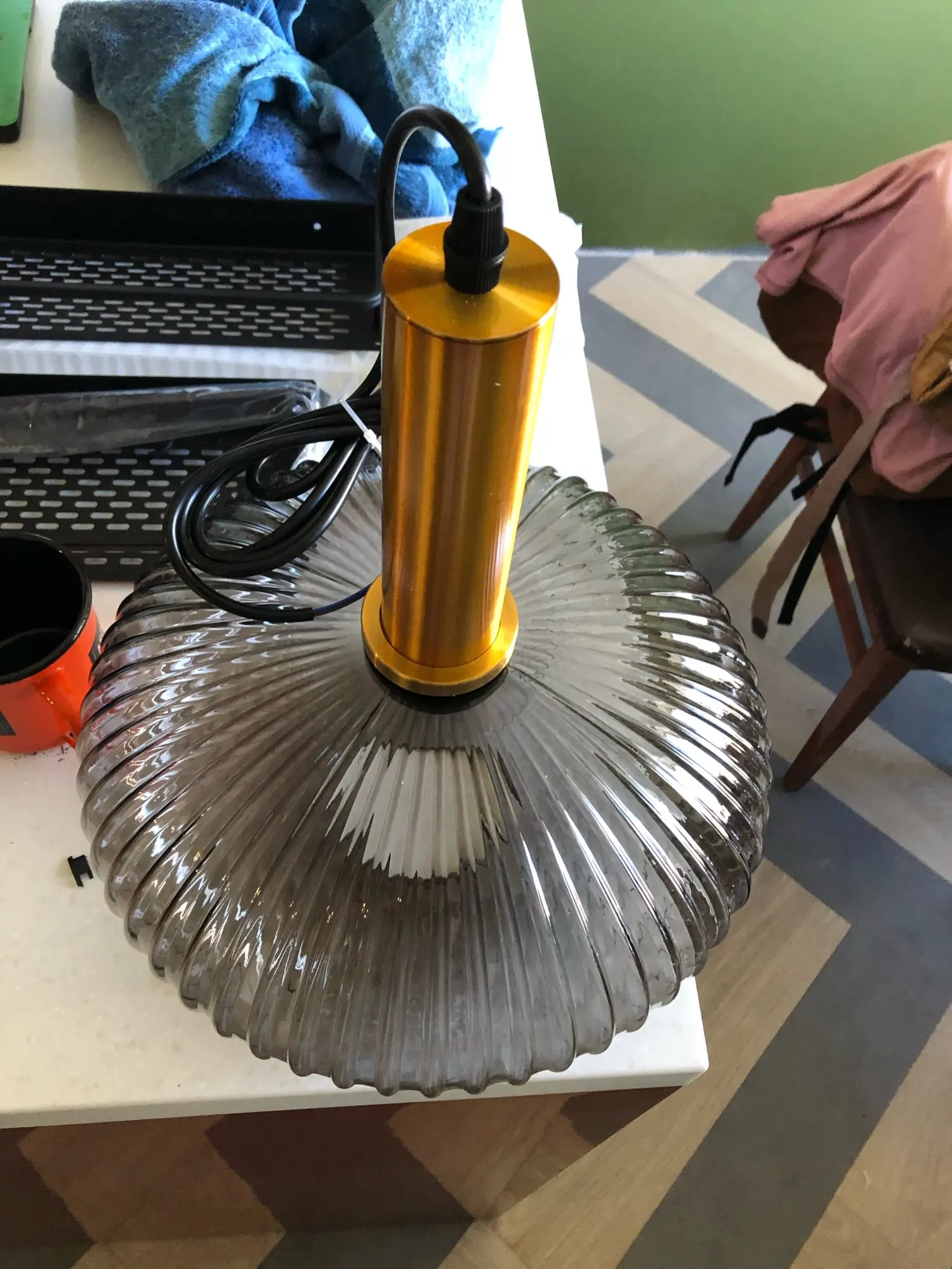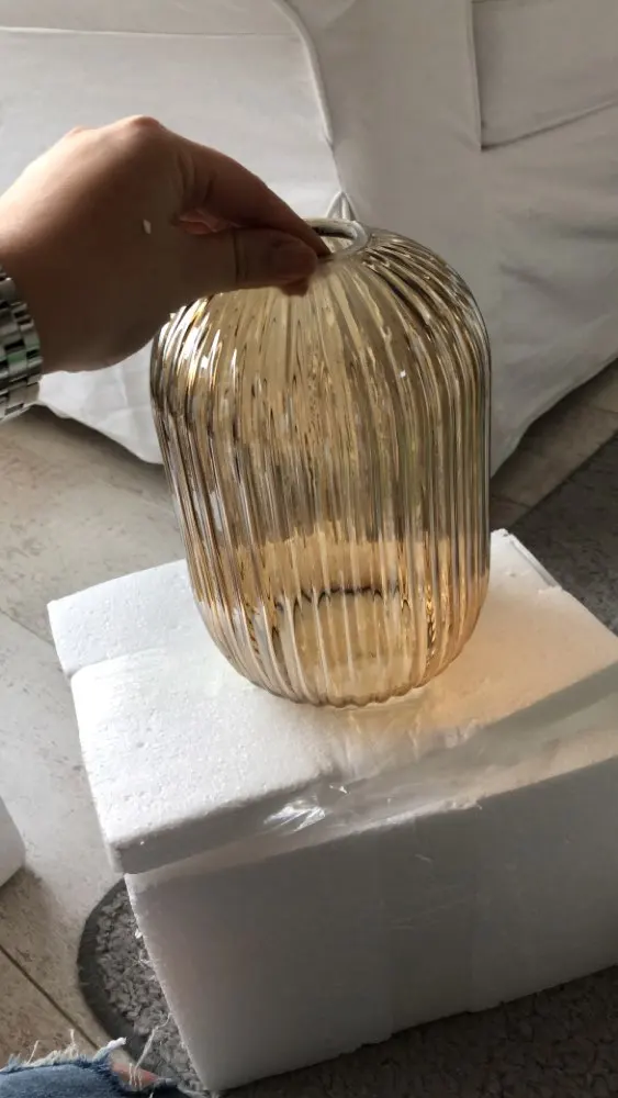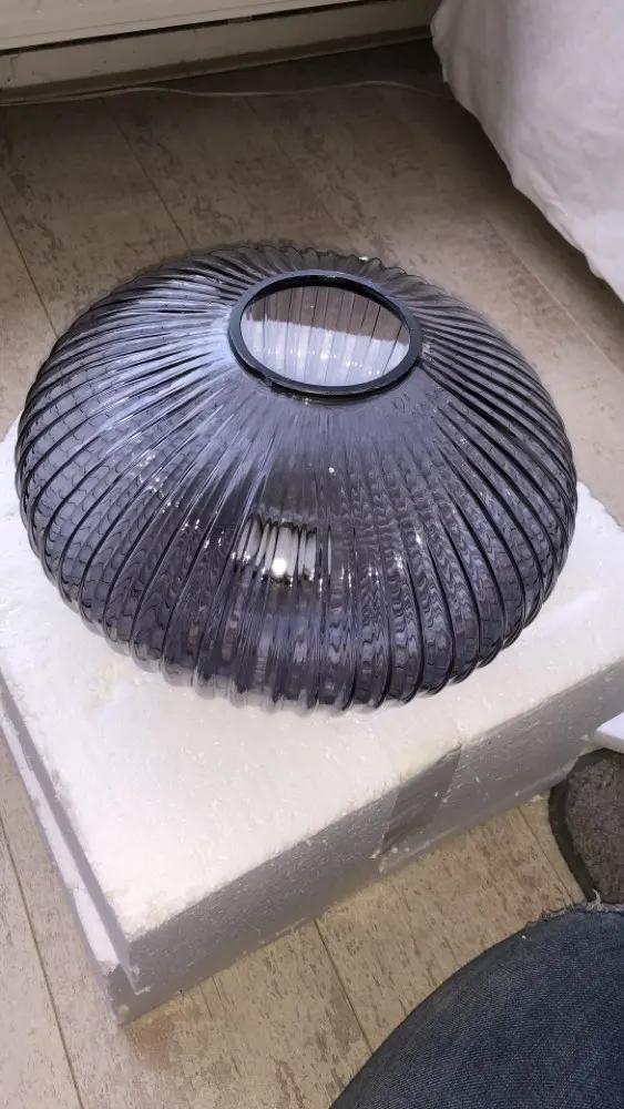 Looks as in the pictures. There's some broken piece in the lamp. Seller is very communicative and sent a new lamp instead very quickly.