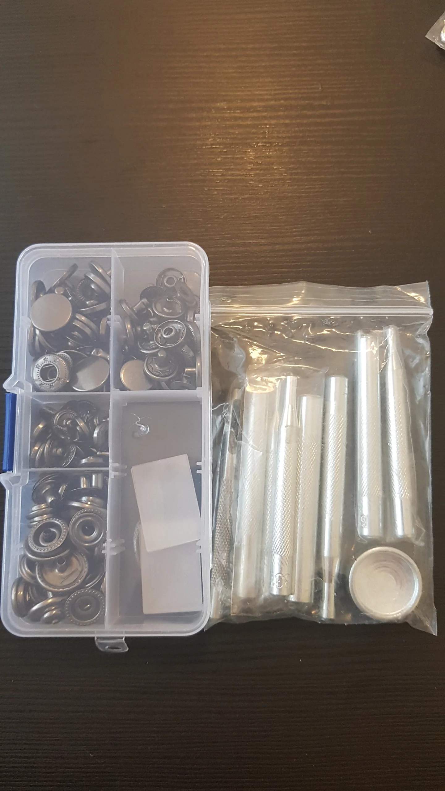 Box with buttons plus an extra package with all the tools to apply them . It all looks very neat and I can't wait to test them!