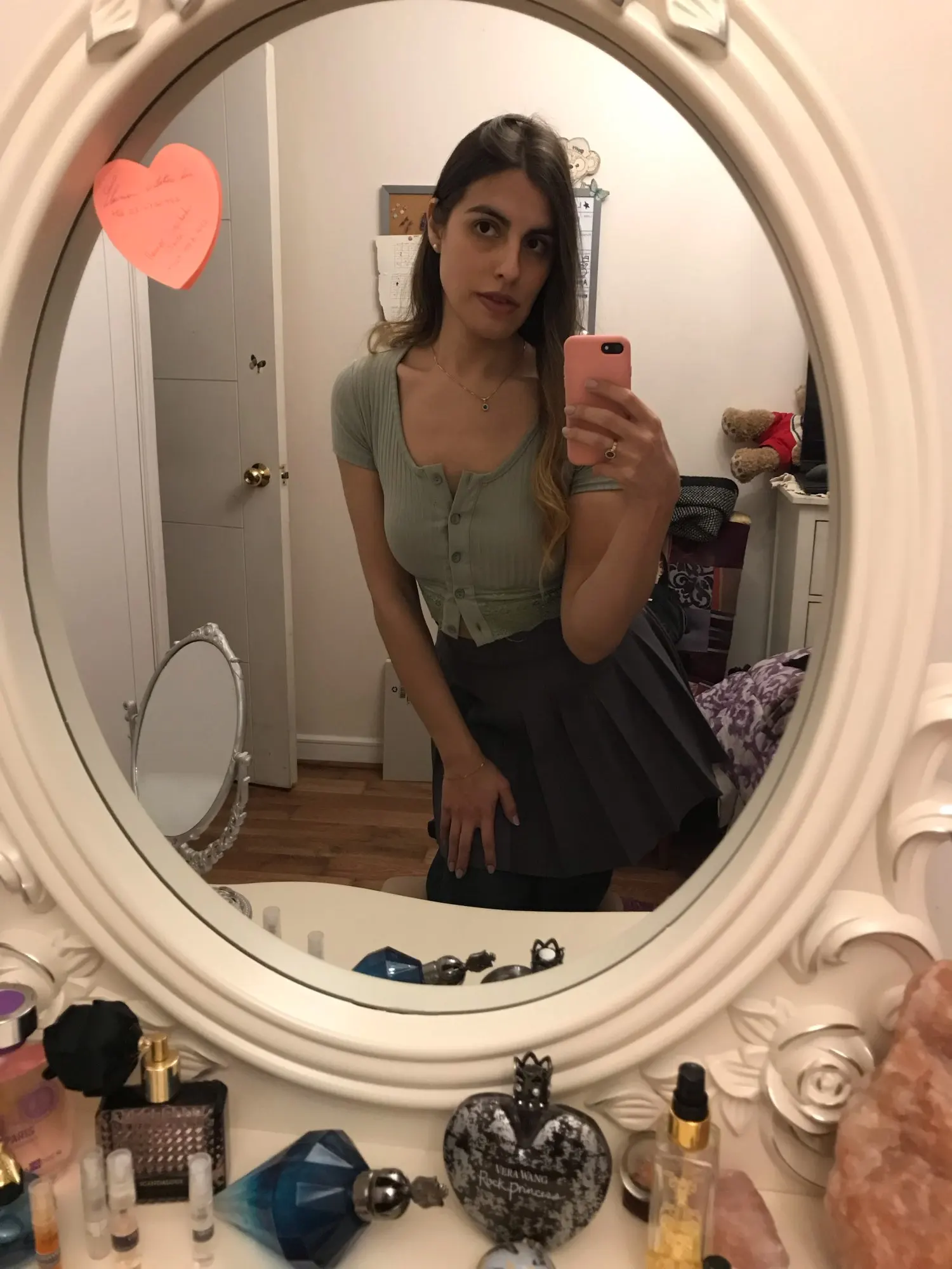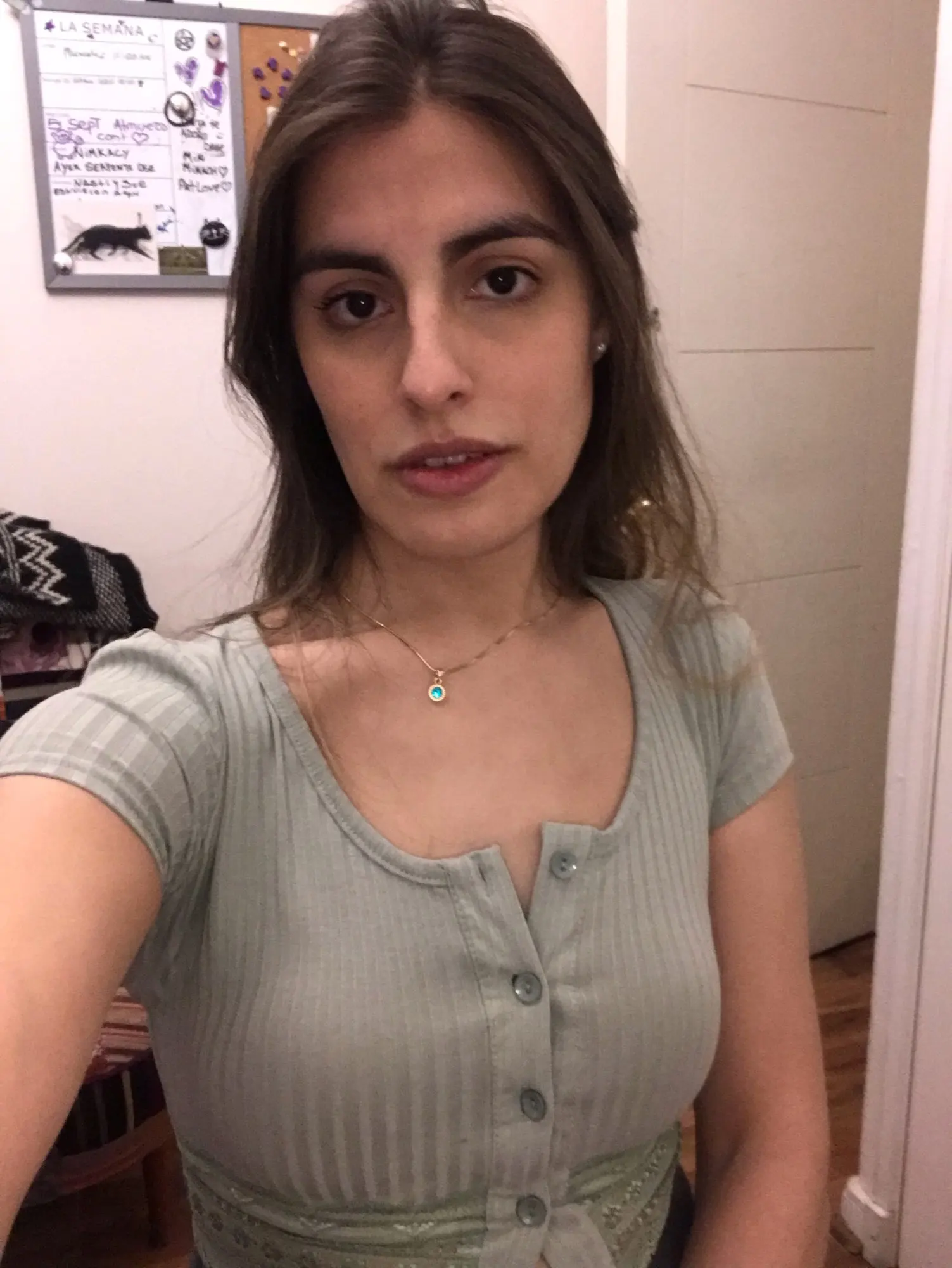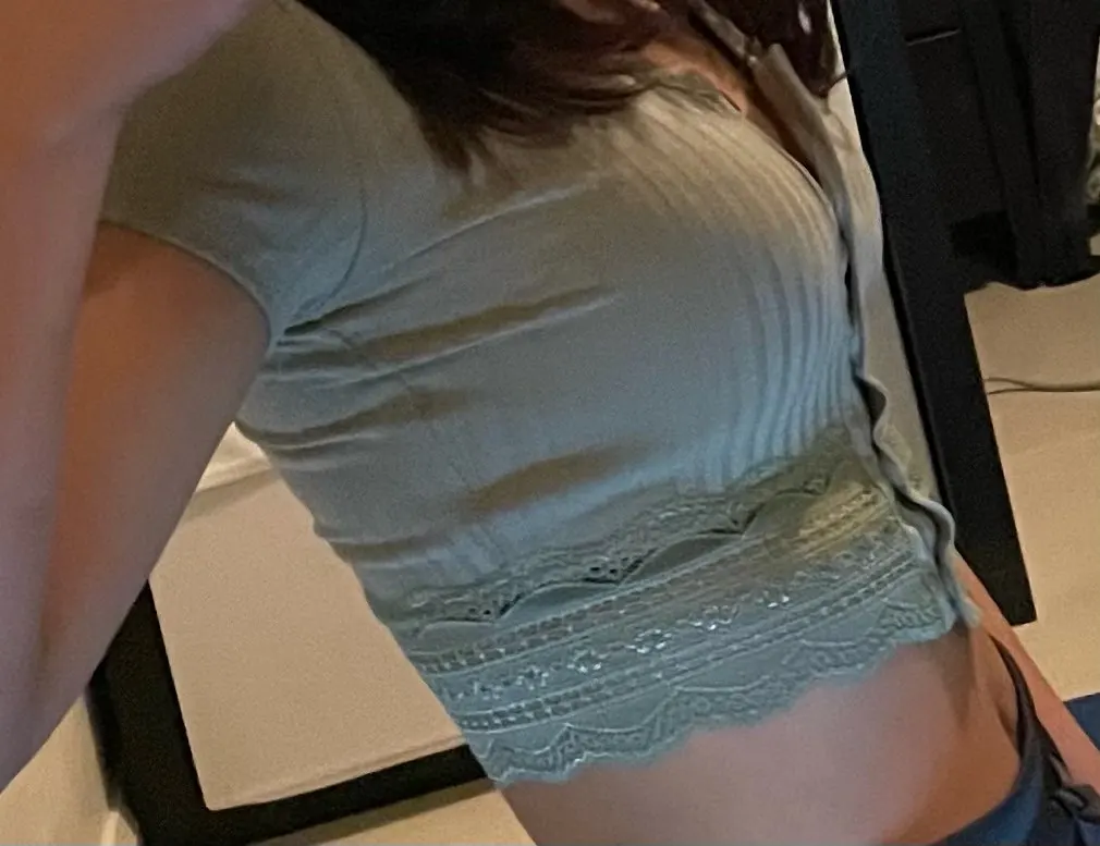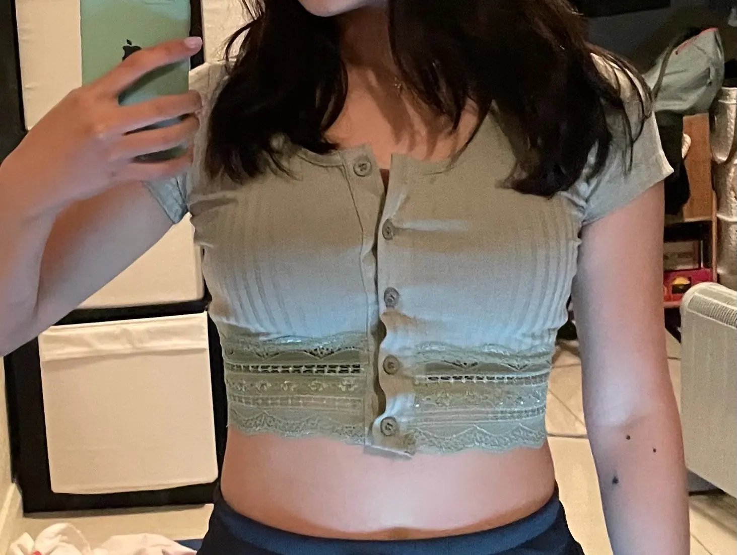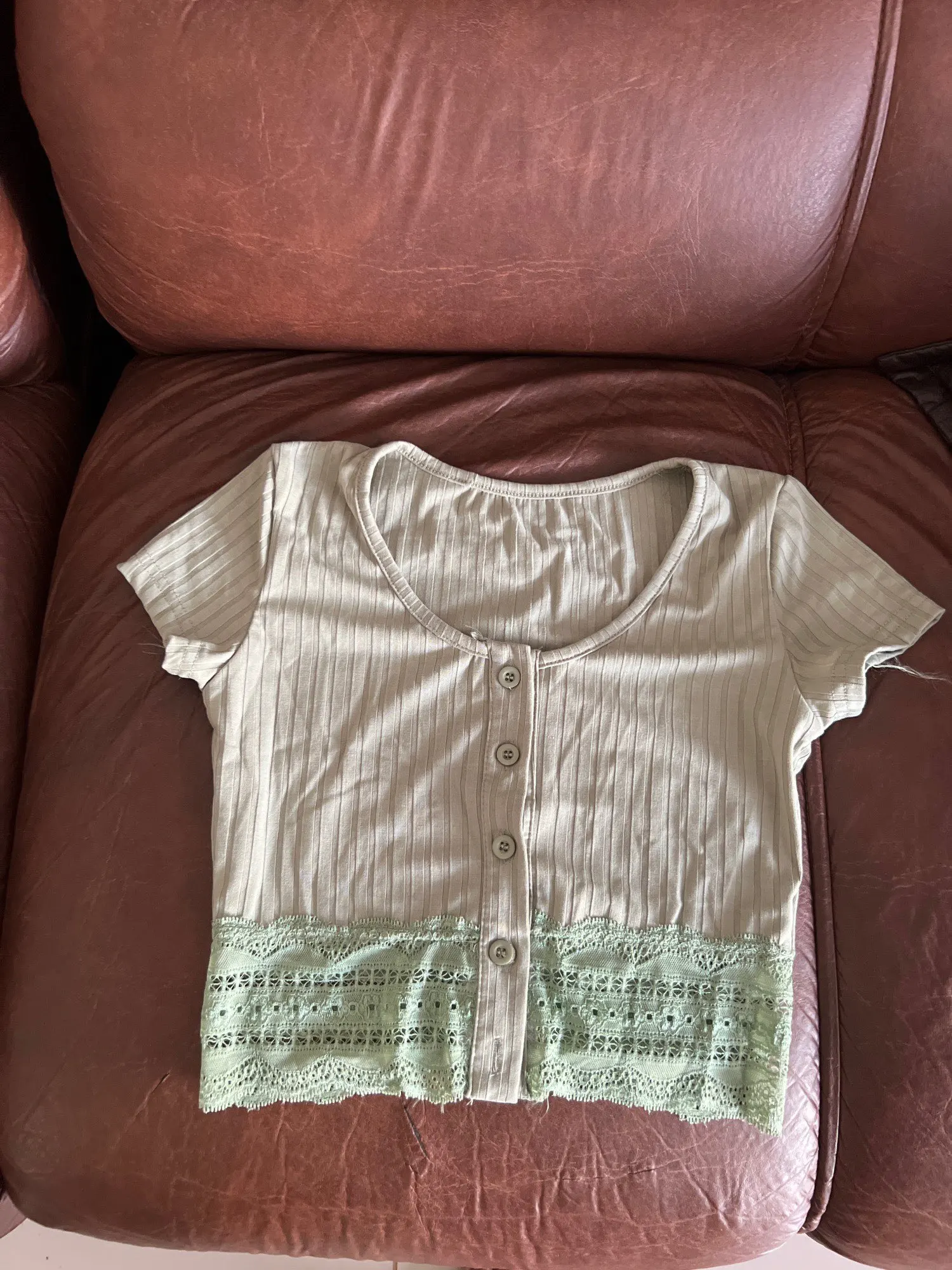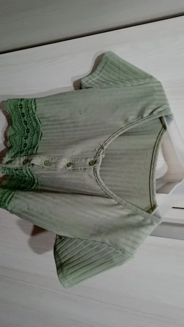 looks exactly like shown. wouldn't be opposed to sizing up bc the fit is like a second skin. beautiful top, one of my favorites now. buttons are sewn on well and button holes are perfect size. amazing quality for total price.
