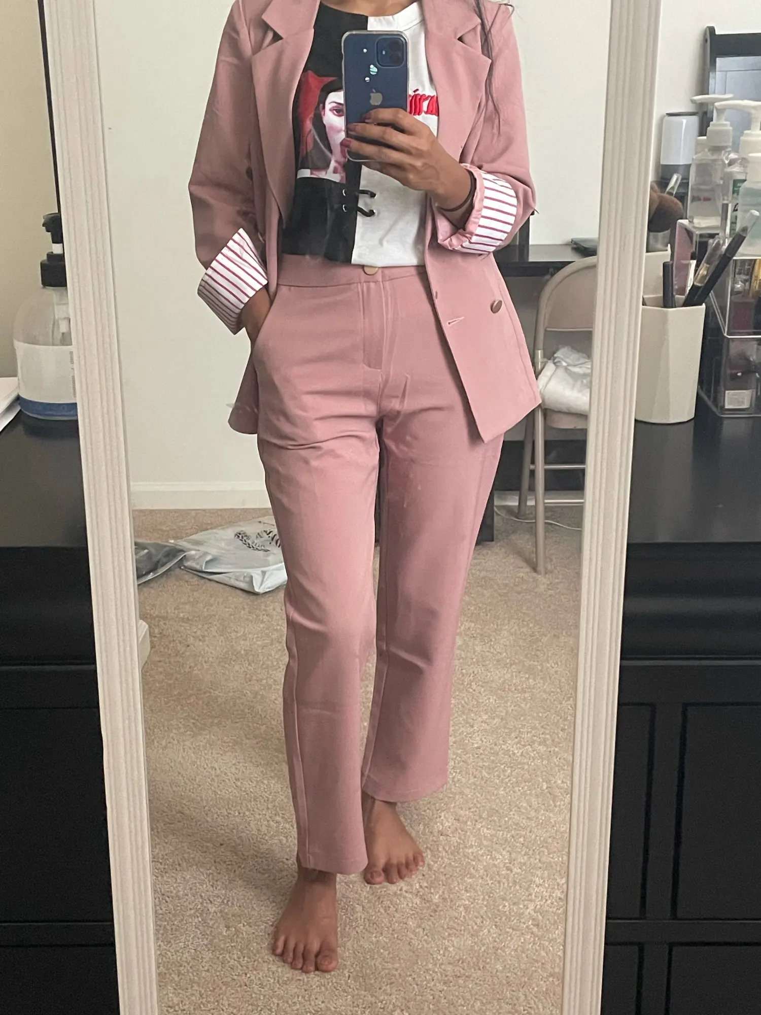 Same color in the picture, nice suit. But the buttons both in the pants and blazer are sewed very loose and weak. One button has fallen out from the blazer.