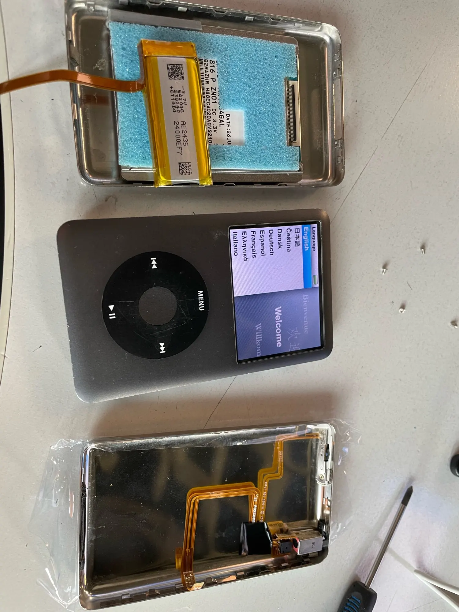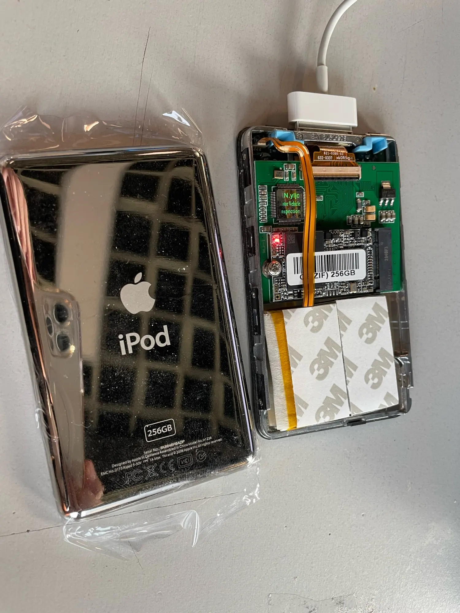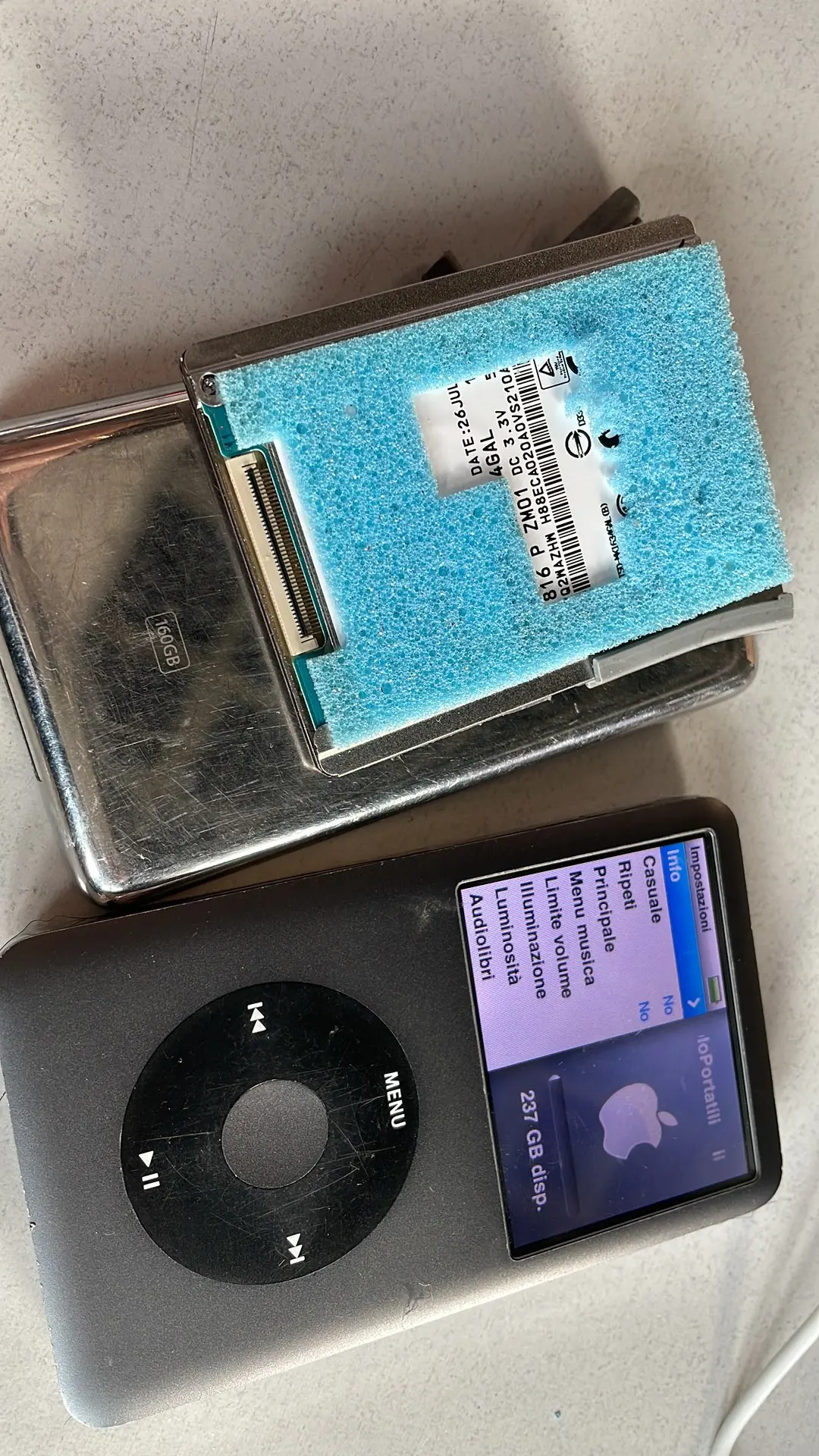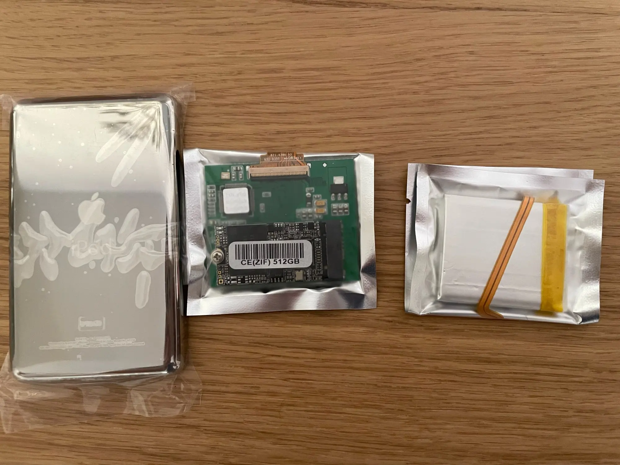 Took a little more than expected to get here, but it’s super easy to install if you know what you’re doing (if not, ask for help, iPods are really easy to mess up). Note that the package doesn’t contain padding for the sad circuit board. I recycled a piece from the original HDD.