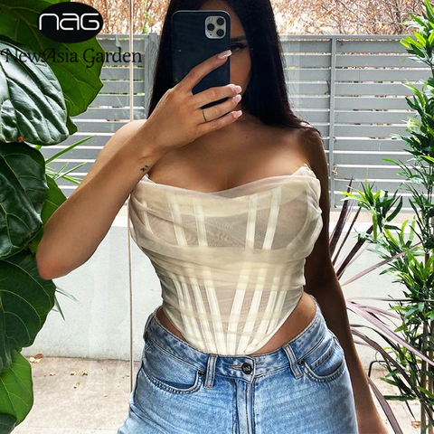 NewAsia See Through Mesh Sexy Crop Top Women Sleeveless Off Shoulder Corset Female Backless Bustier Tops Underwear Streetwear