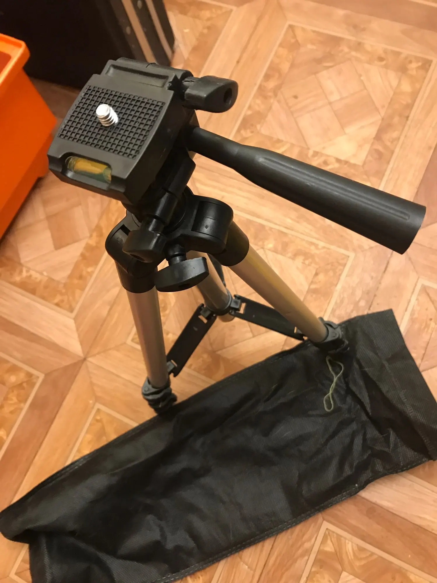 The tripod is not bad, the box is wrinkled, on the tripod there are a couple of small dents from different sides. Instead of a bag, a simple fabric cover.