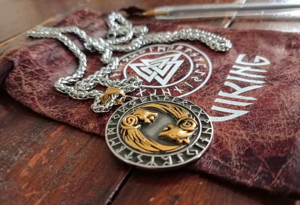 Nordic Viking Stainlesss Steel Geri and Freki Wolf Rune Necklace With Valknut Gift Bag