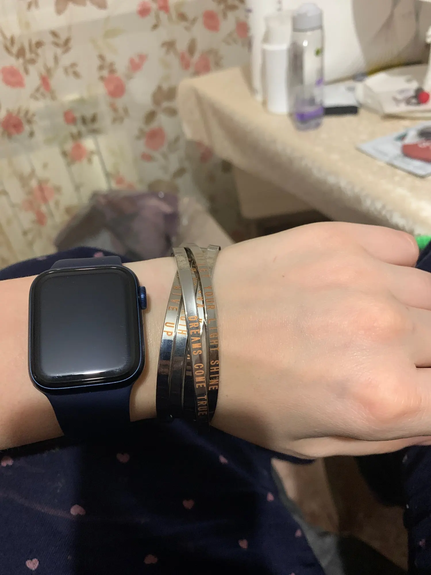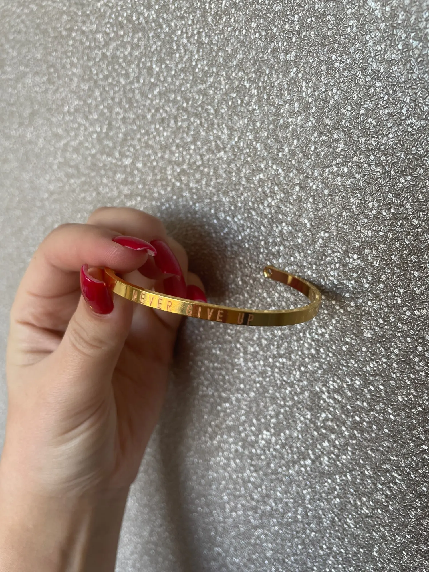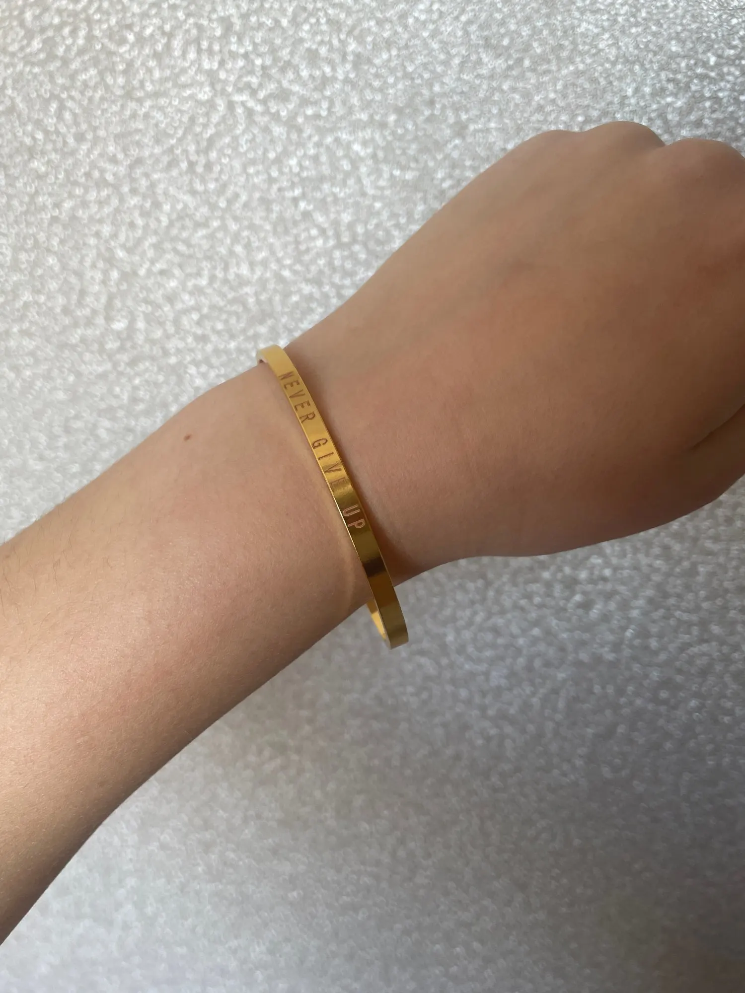 I dont like the lettering... its look like a stamp is not as the picture, and the bangle is to yellow,no gold...