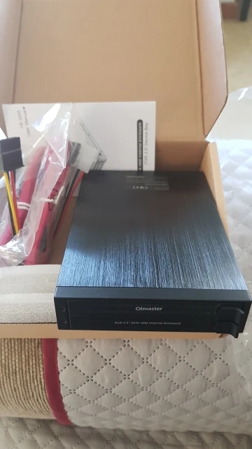 Precision work. Good quality product. Fits perfectly into the floppy bay. What the pictures do not show properly is the built-in eject mechanism. With a SSD/HDD inserted, the widely open drive doors also act as an eject lever. You grab the door as a handle, and push/slide inwards. This will press another lever on the backplate which gently kicks the SSD or HDD outward. Two SATA data sockets, one for each storage slot. A single SATA power socket, powers both storage slots. I am very satisfied with this enclosure. A worthwhile purchase.