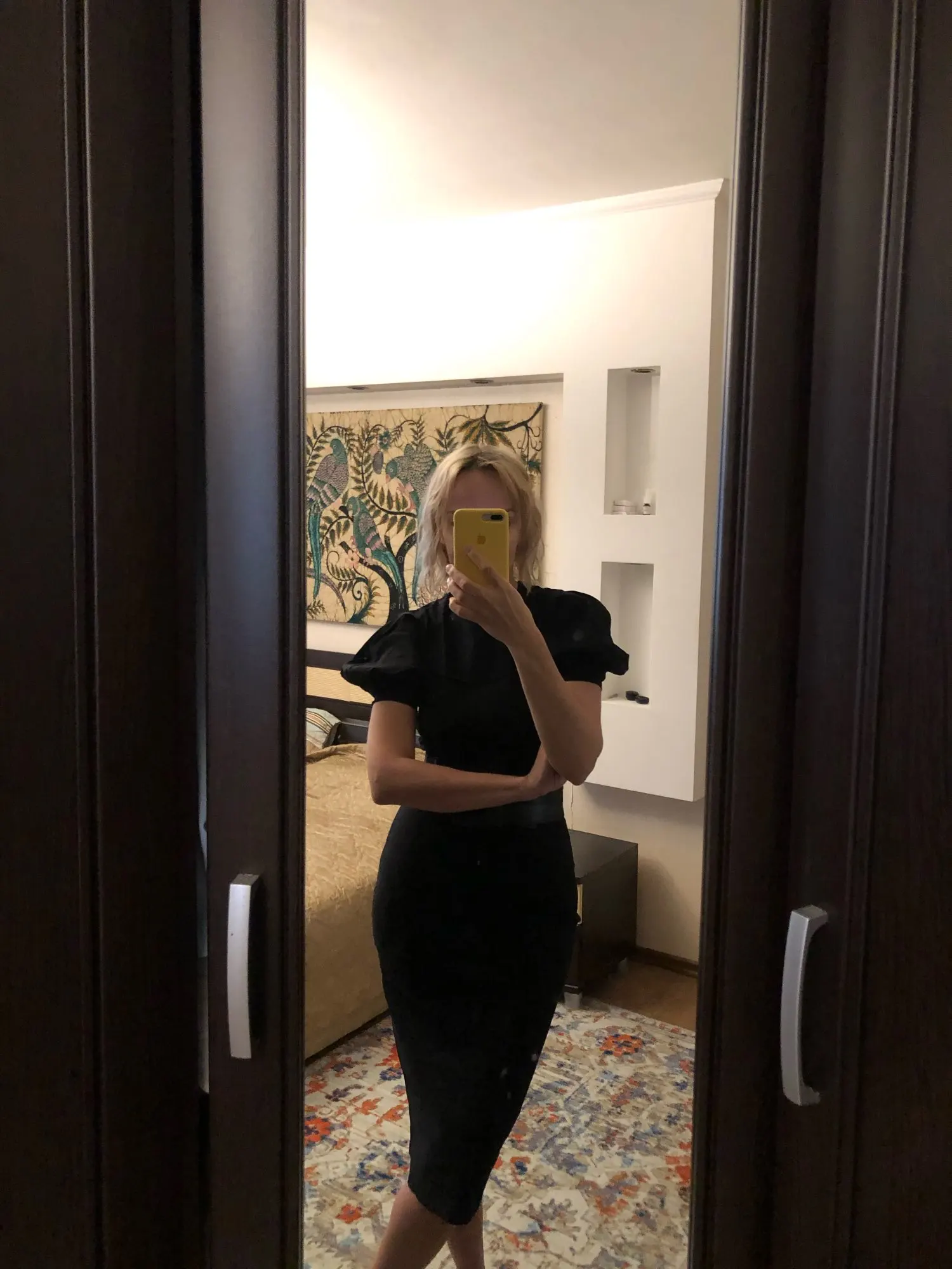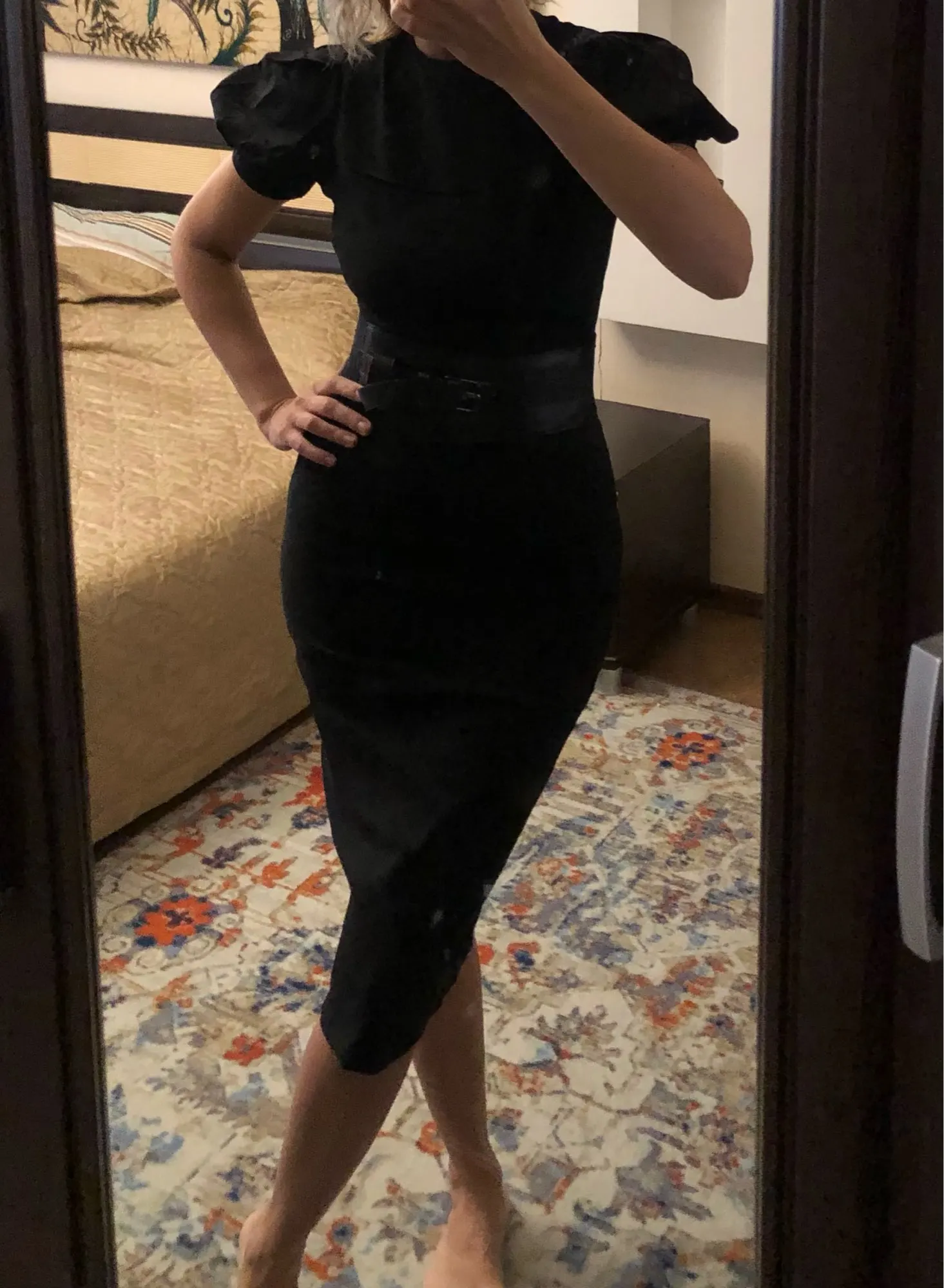 OOTN Casual Black Midi Dress Ladies Short Sleeve Elegant Women Dresses High Waist Slim O Neck Puff Sleeve Summer Pencil Dress