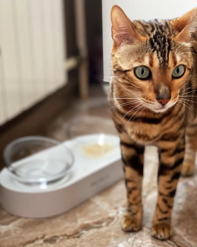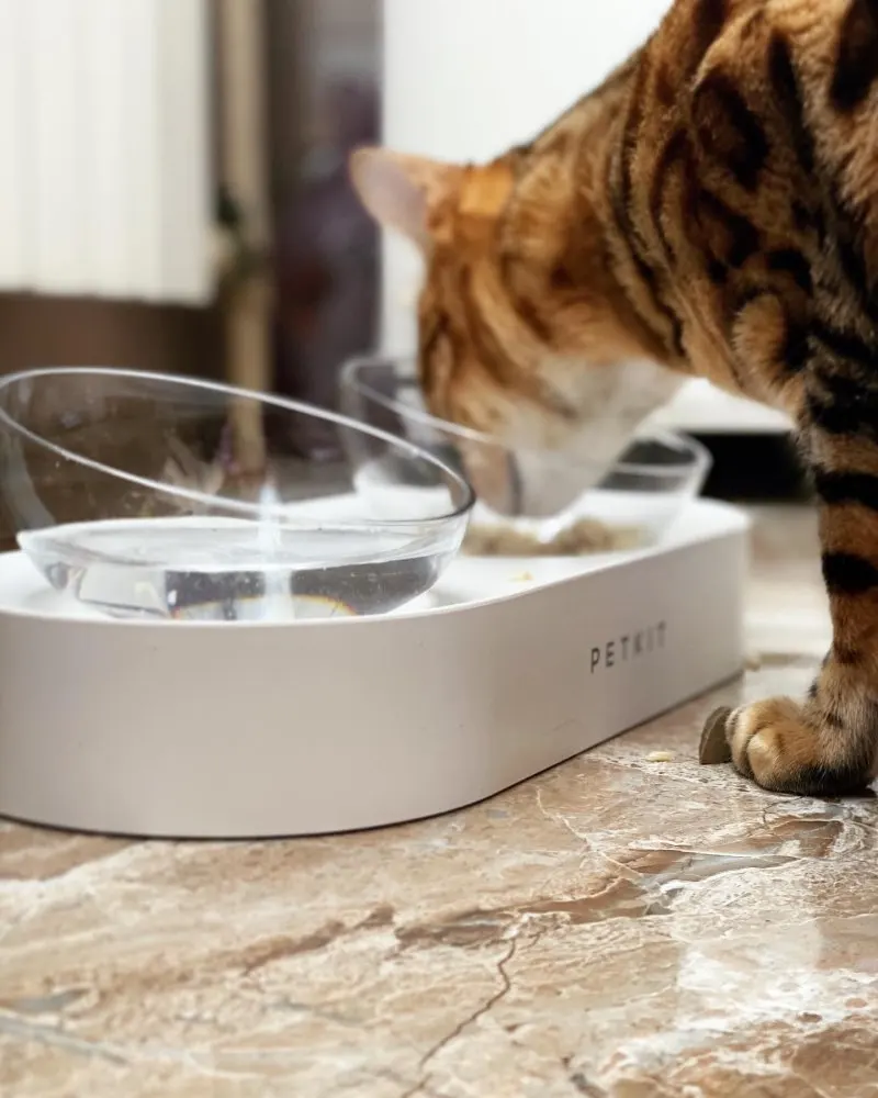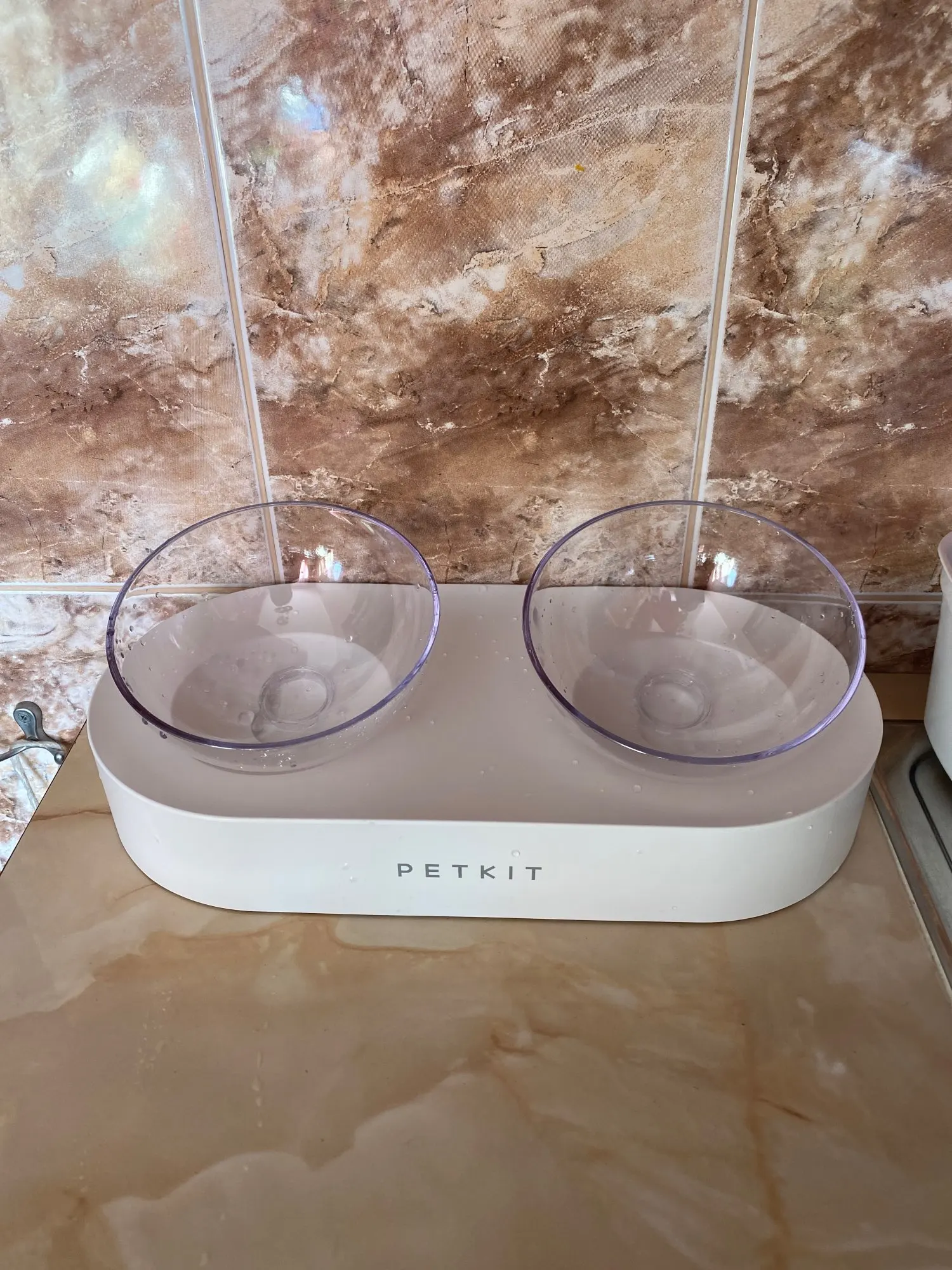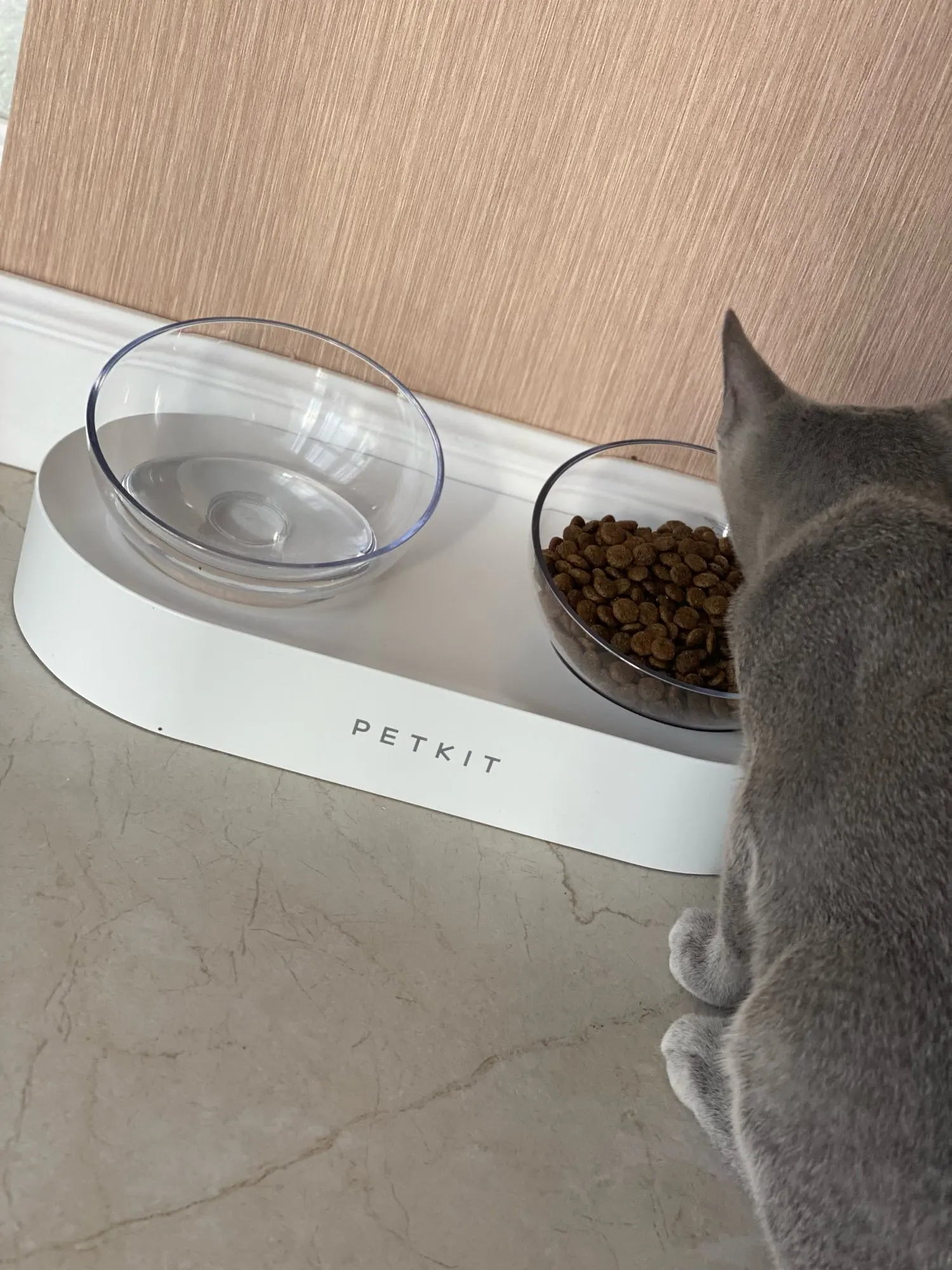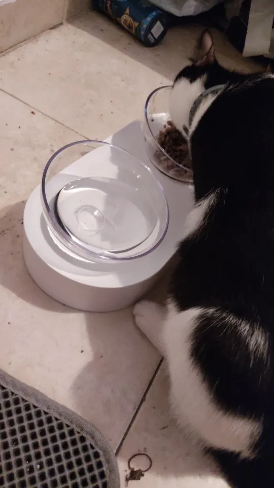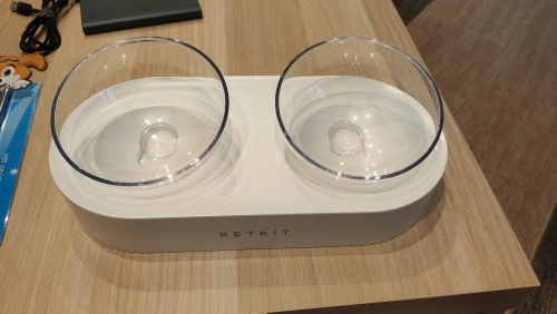 very honest seller!!! and very good item. it's plastic but looks stylish and is comfortable for cats - food always stays in the middle because of hemispherical bowls form