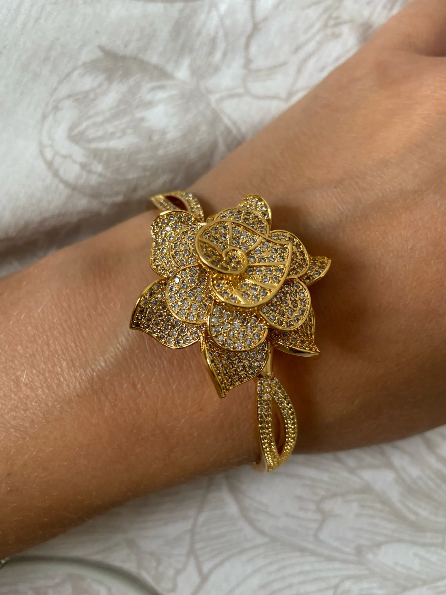 Pera Luxurious Bridal Wedding Dubai Yellow Gold African AAA+ Cubic Zirconia Big Flower Shape Bangle Sets for Women Jewelry Z040