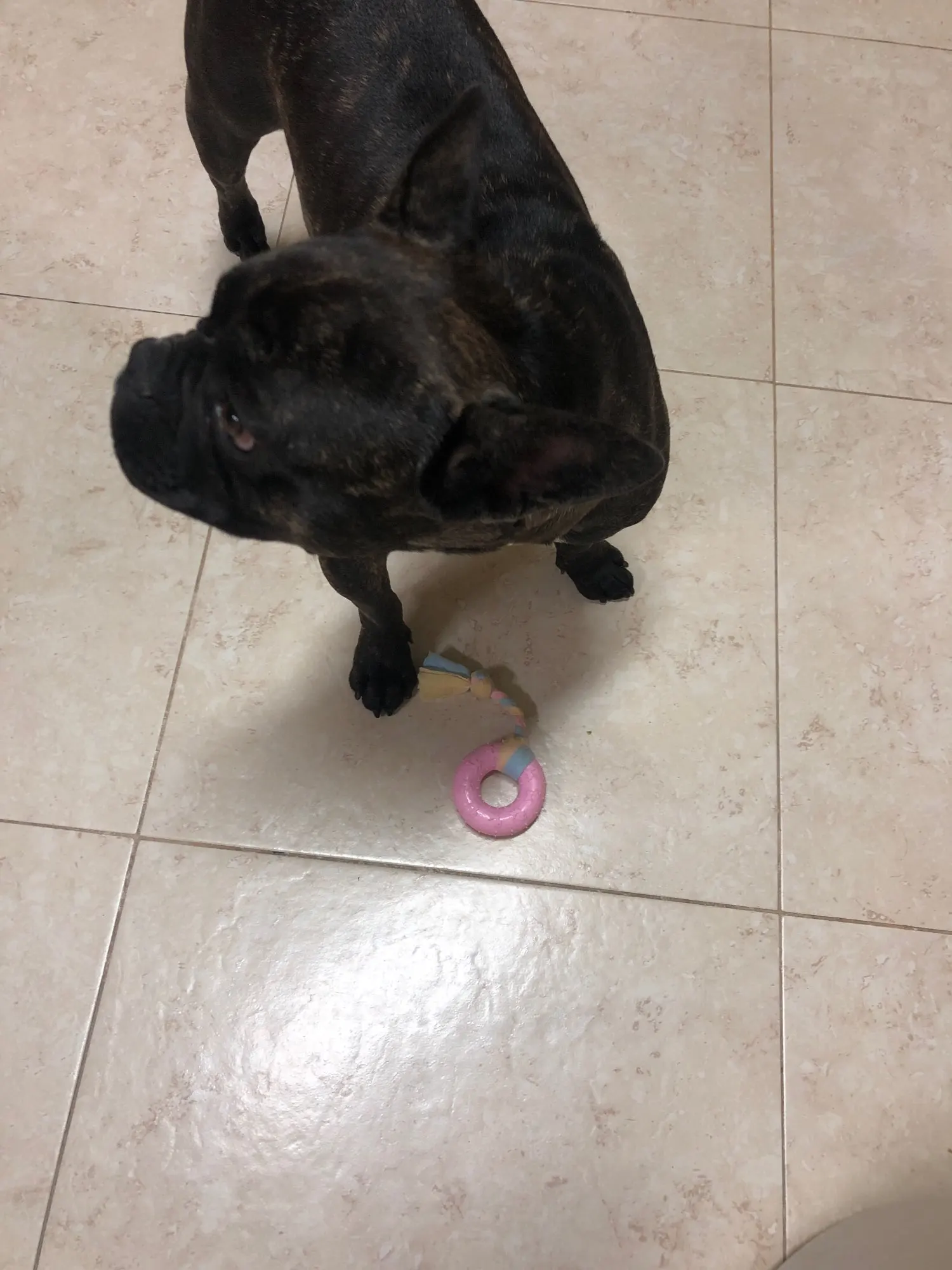 The product itself is just as pictured, but I was expecting it to be a lot bigger... I have a 3 old month puppy who is a Rottweiler-German Shepard mix and he could swallow the toy easily if left without supervision... I'm satisfied with the product but not with the lack of information about the size.