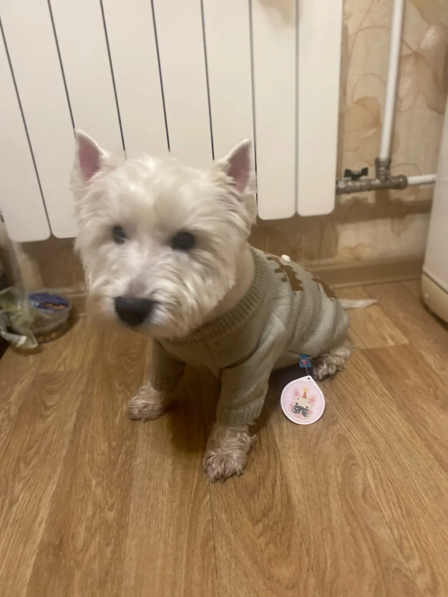 Very nice sweater. I got a size M for my yorkshire terrier who weighs around 8.5kgs and fits nice. But because this sweater is meant for bulldogs the neck is very wide on him. But the lenght is perfect. Very cute for christmas and even on walks.