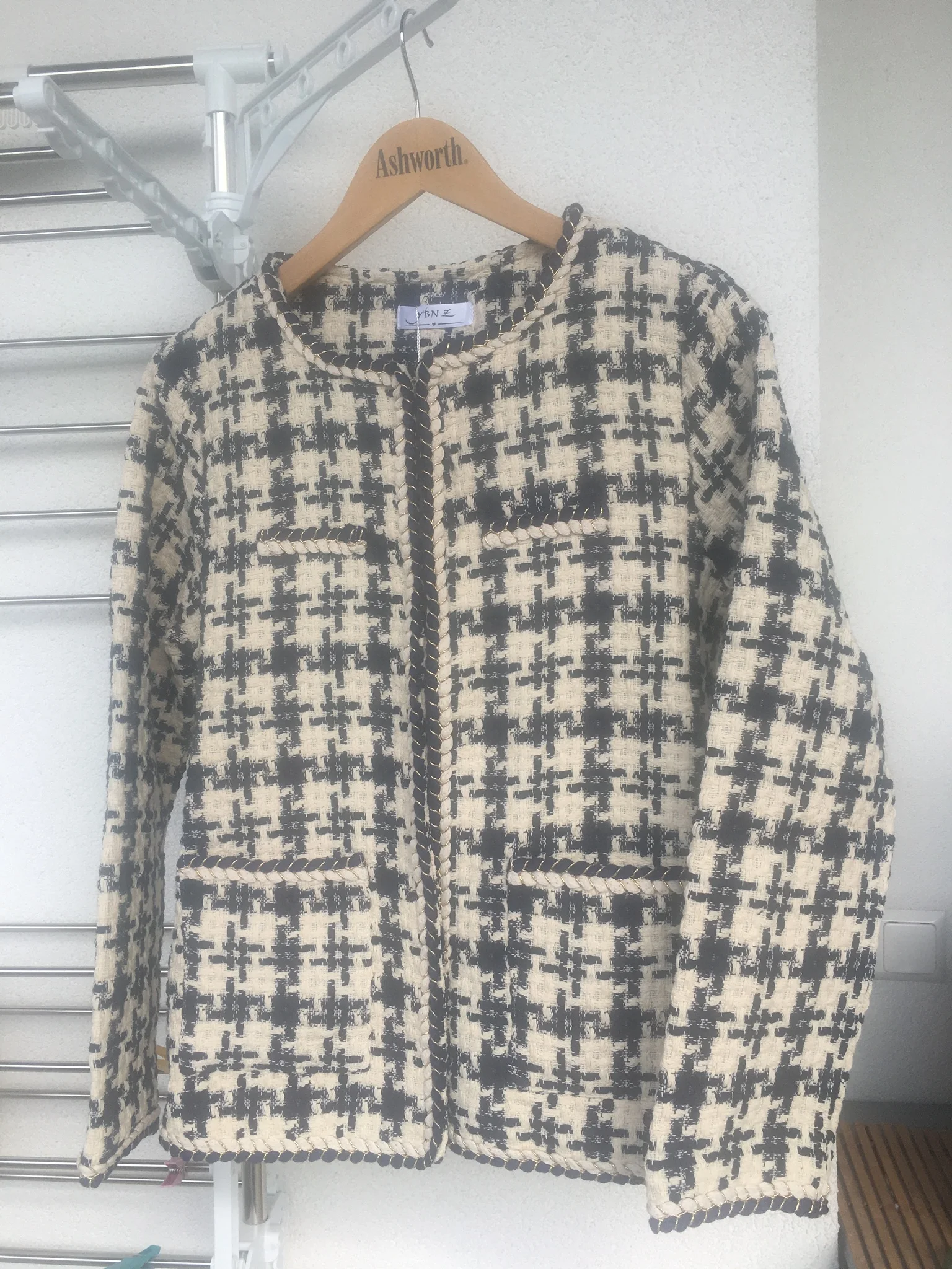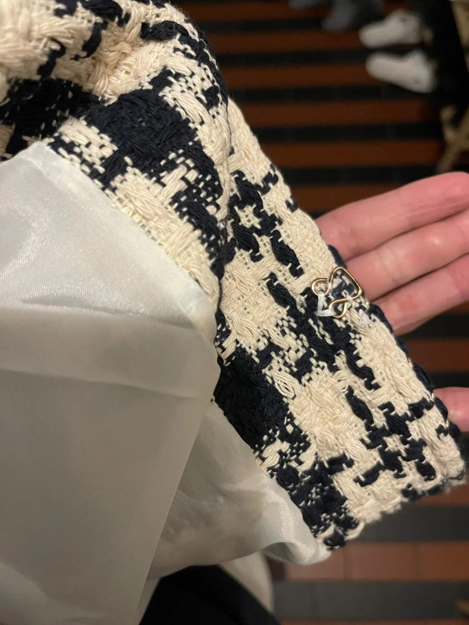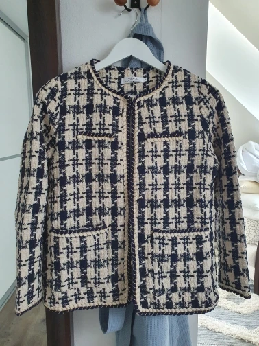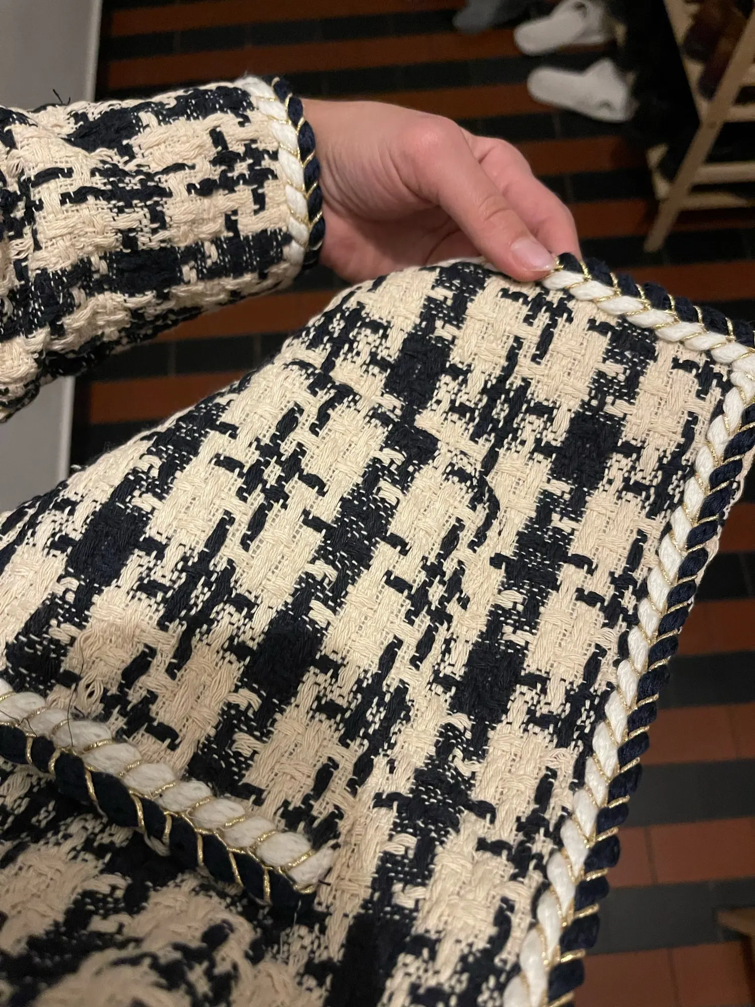 Nice as pictured more beige and navy. some chalk markings which need to be drycleaned. seller shipped goods fast and received in 2 weeks.