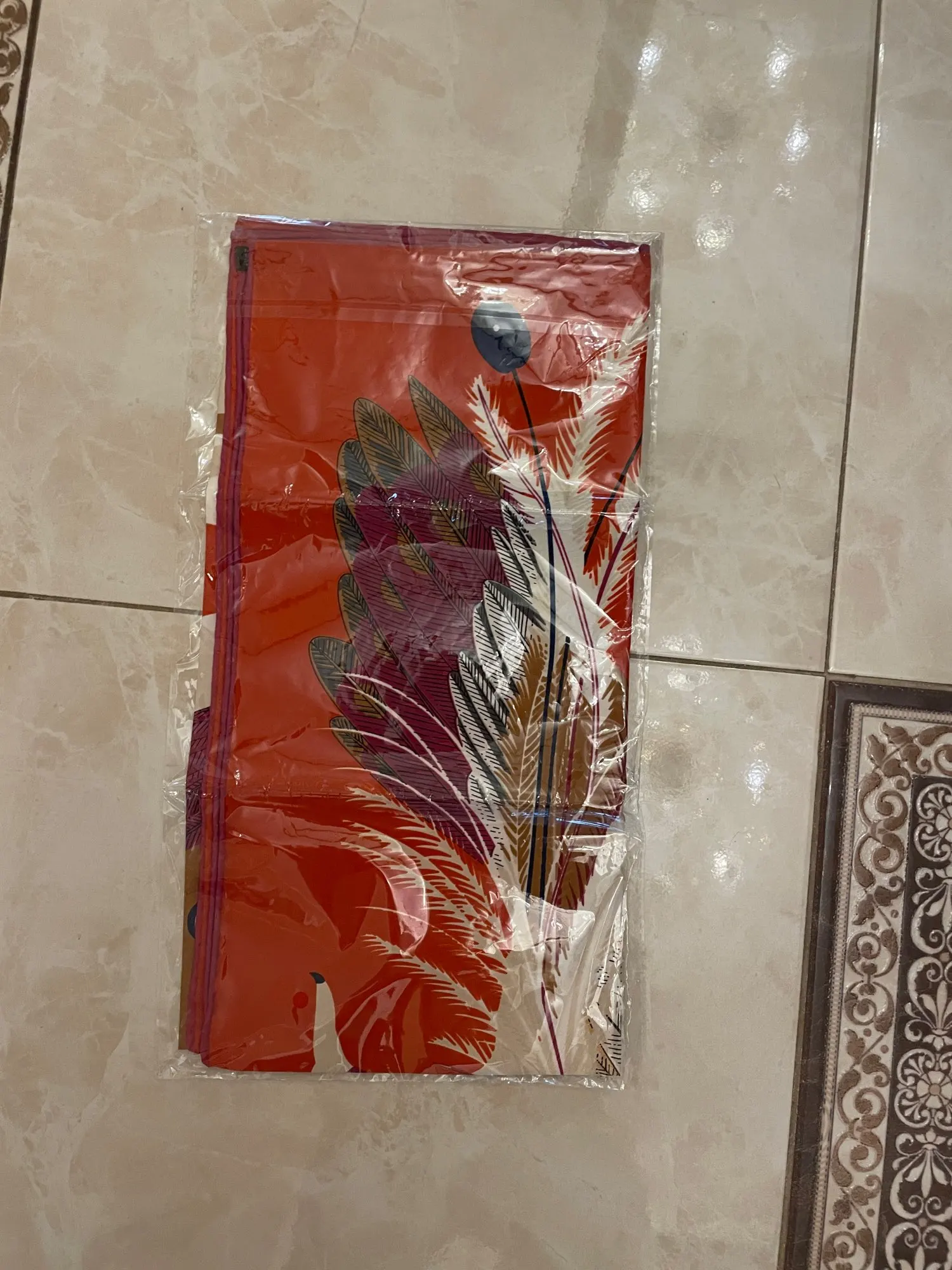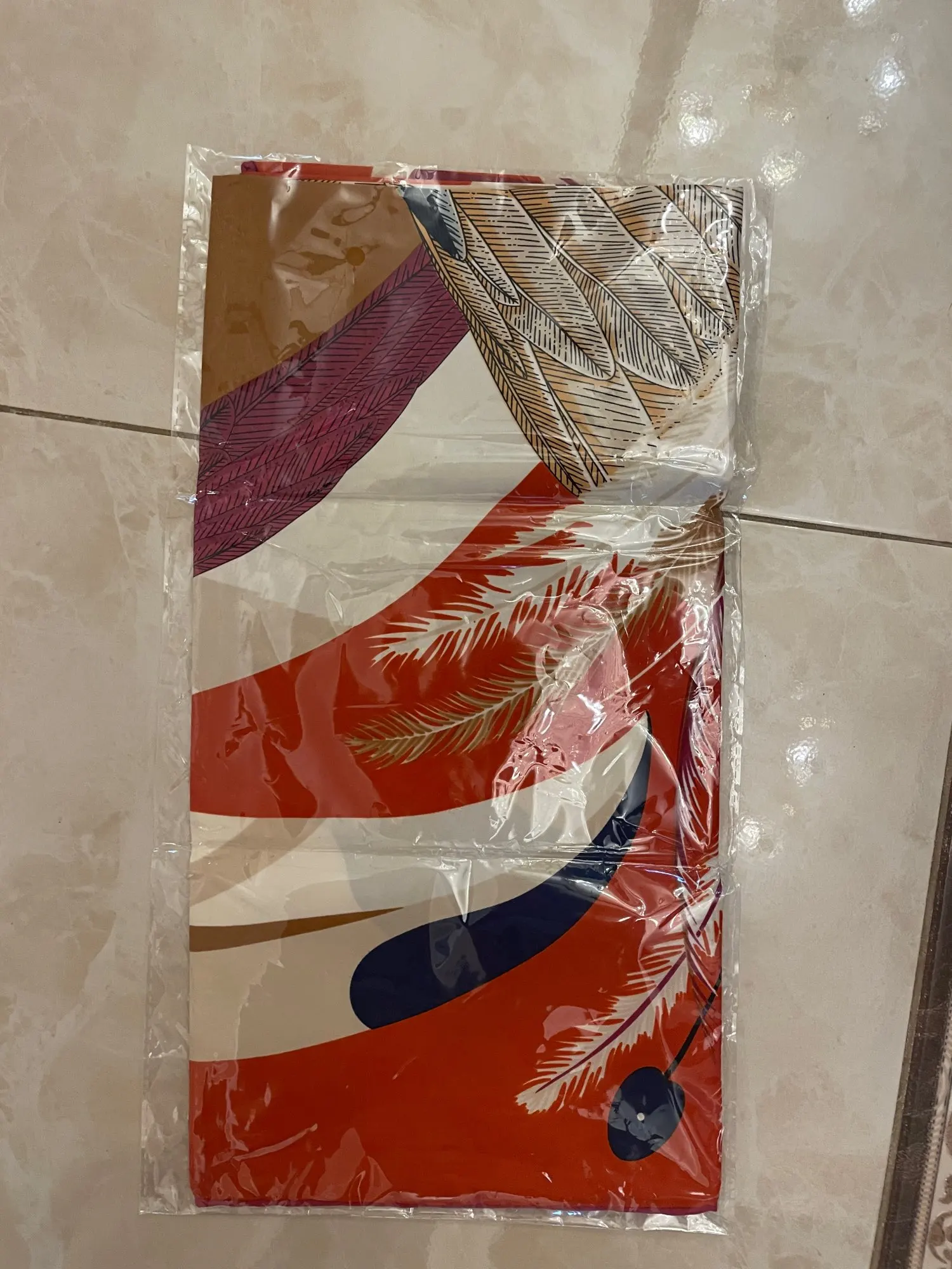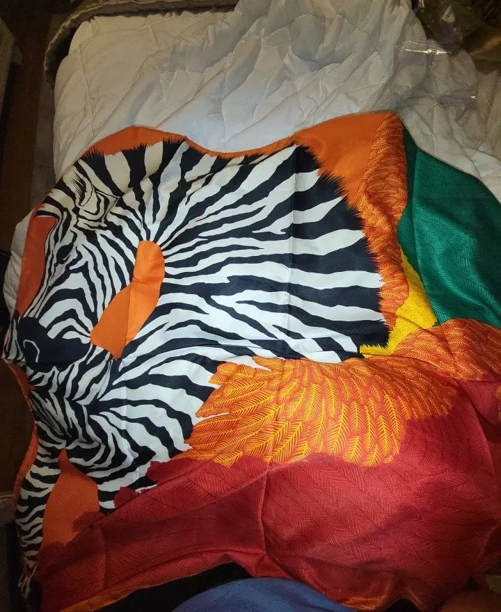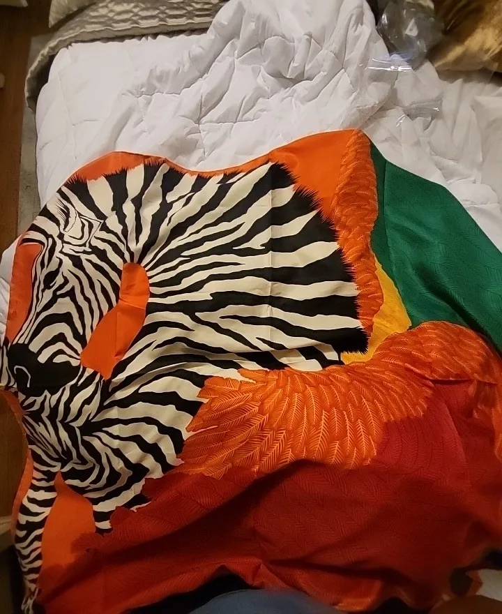 Surprisingly fast shipping to Europe. Scarf looks wonderful. I love the colors which are really saturated and the pattern. The fabric feels great, smooth how it is supposed to be. I would definitely buy again