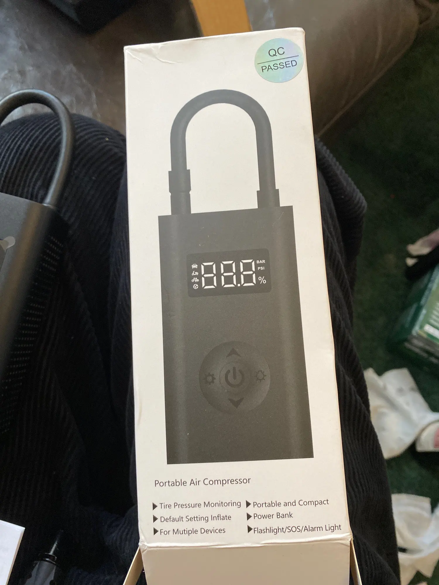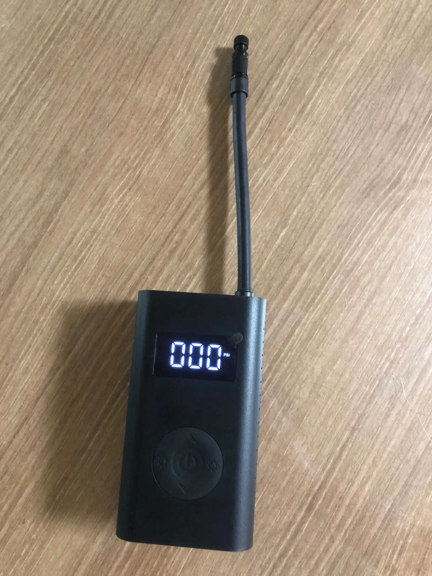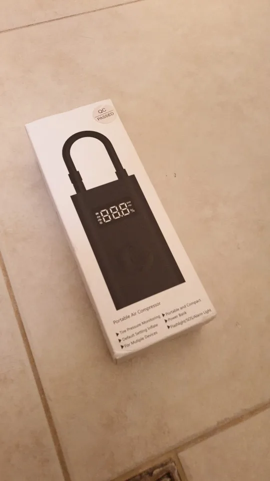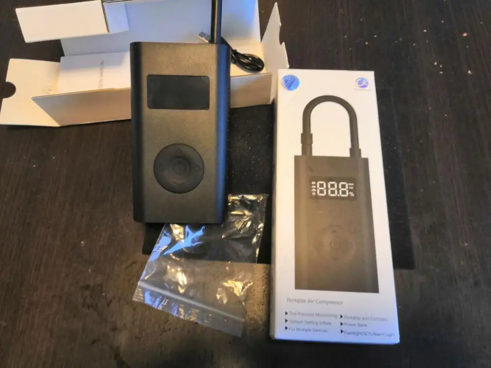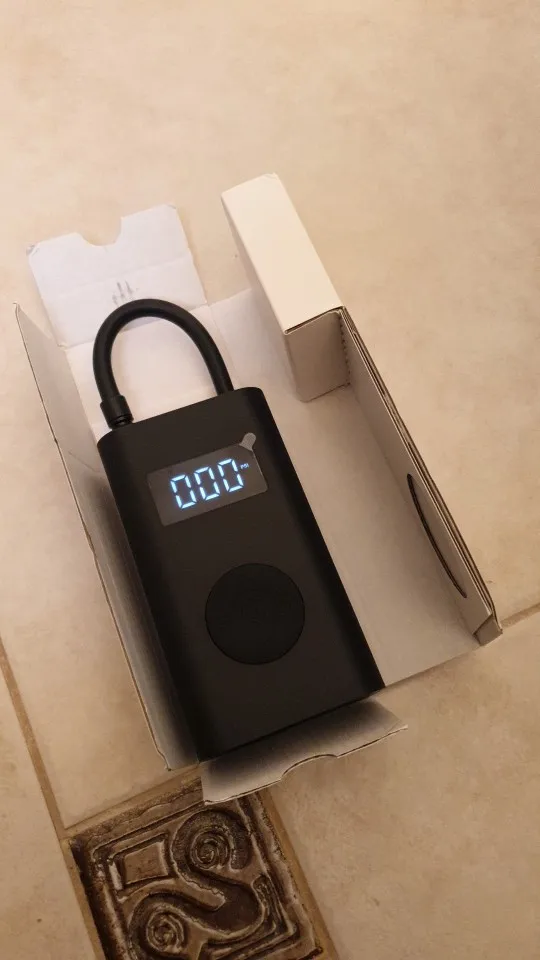 Warning - this is NOT "Xiaomi Mi Portable Electric Air Compressor" This item is different model from manufacturer called GONGFUKE (name was hidden under QA label). I am not saying it is a bad thing.. Good things in comparison to MI: - Remaining battery is shown in % on display! - Pump has USB Battery bank functionality (looks like 5V 0.5A charging) - Flashlight is on other end.. and is quite useful and powerful. Useful as flashlight, no so in pumping process. What's missing: - NO Storage bag in the included set.. so nowhere to put pump and included adapters / cable. - No reviews for this model in internet.. so do not assume, it has the same reliability (I have no issues..) - Bottom of case has no rubber caps on ports.. so can be issue pumping tires in the wet or puddle..