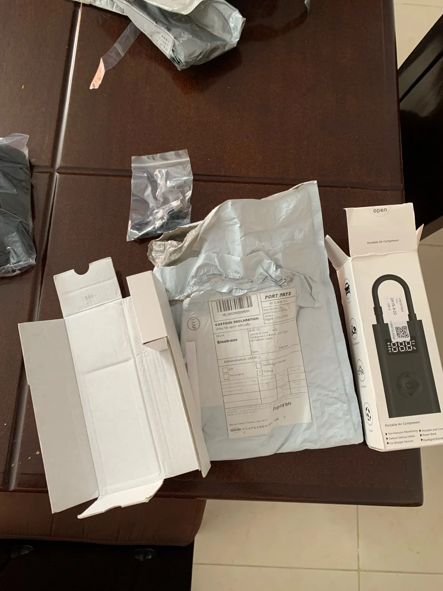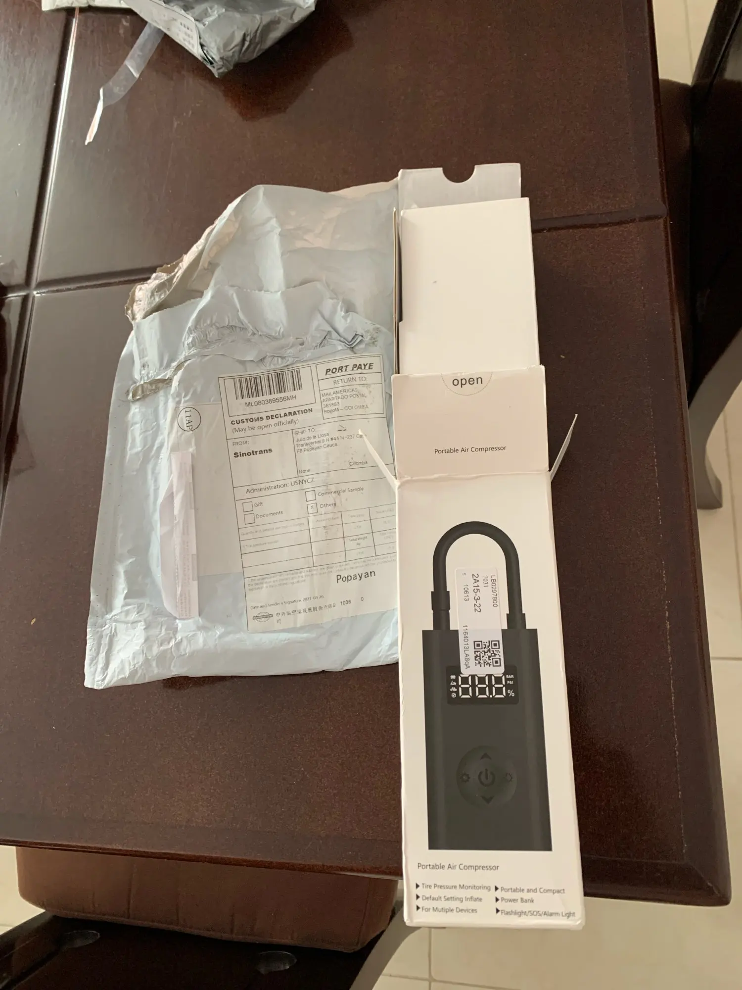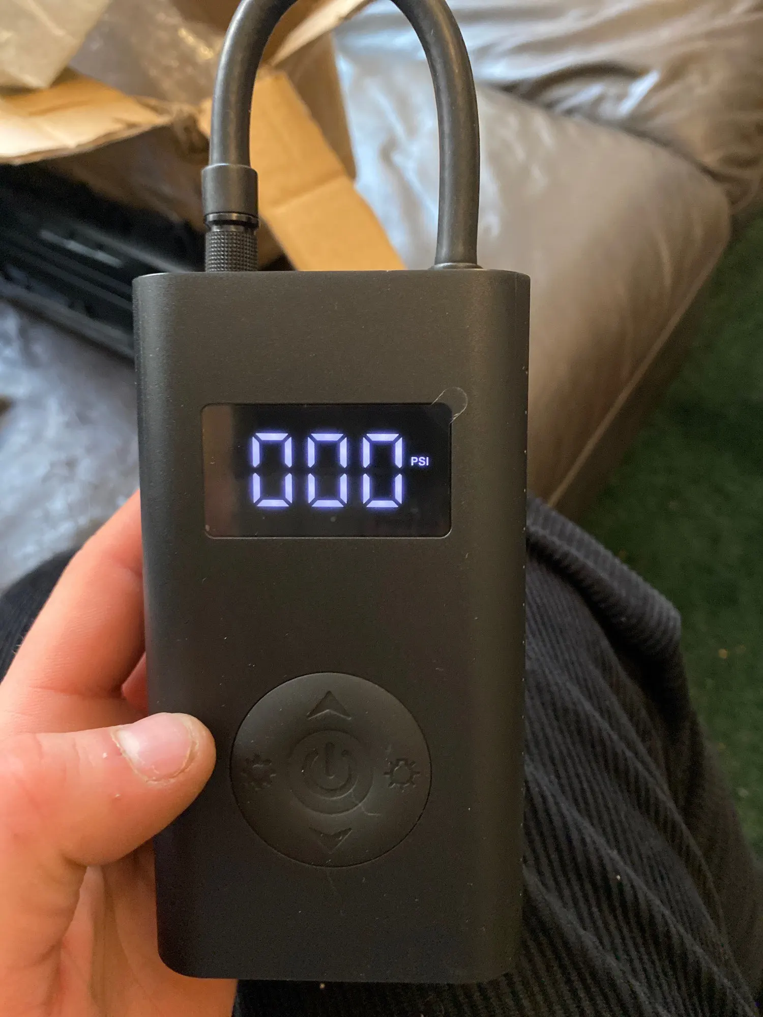 Warning - this is NOT "Xiaomi Mi Portable Electric Air Compressor" This item is different model from manufacturer called GONGFUKE (name was hidden under QA label). I am not saying it is a bad thing.. Good things in comparison to MI: - Remaining battery is shown in % on display! - Pump has USB Battery bank functionality (looks like 5V 0.5A charging) - Flashlight is on other end.. and is quite useful and powerful. Useful as flashlight, no so in pumping process. What's missing: - NO Storage bag in the included set.. so nowhere to put pump and included adapters / cable. - No reviews for this model in internet.. so do not assume, it has the same reliability (I have no issues..) - Bottom of case has no rubber caps on ports.. so can be issue pumping tires in the wet or puddle..