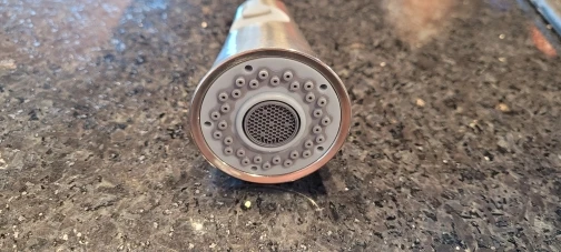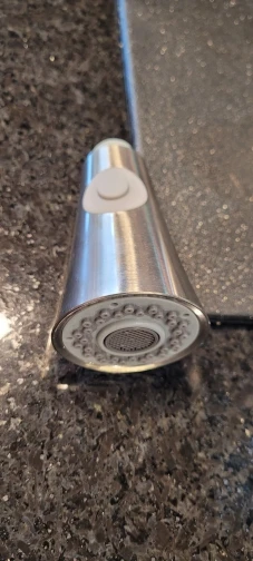 It's still too early to write about reliability, but operates identically to the original spray head. It is very shiny, but reflected image is a bit wavy, indicating some undulations in the machining of the underlying plastic.
