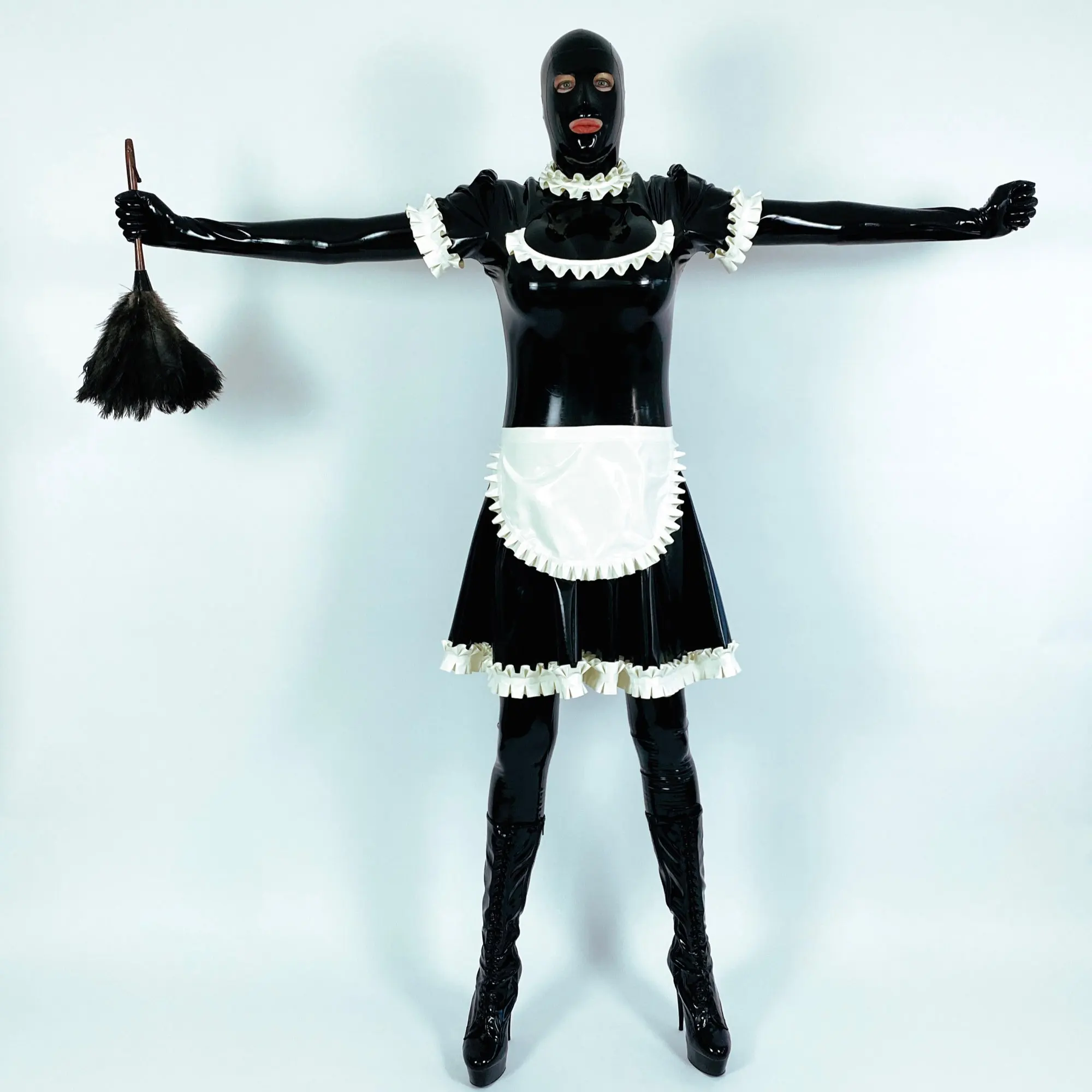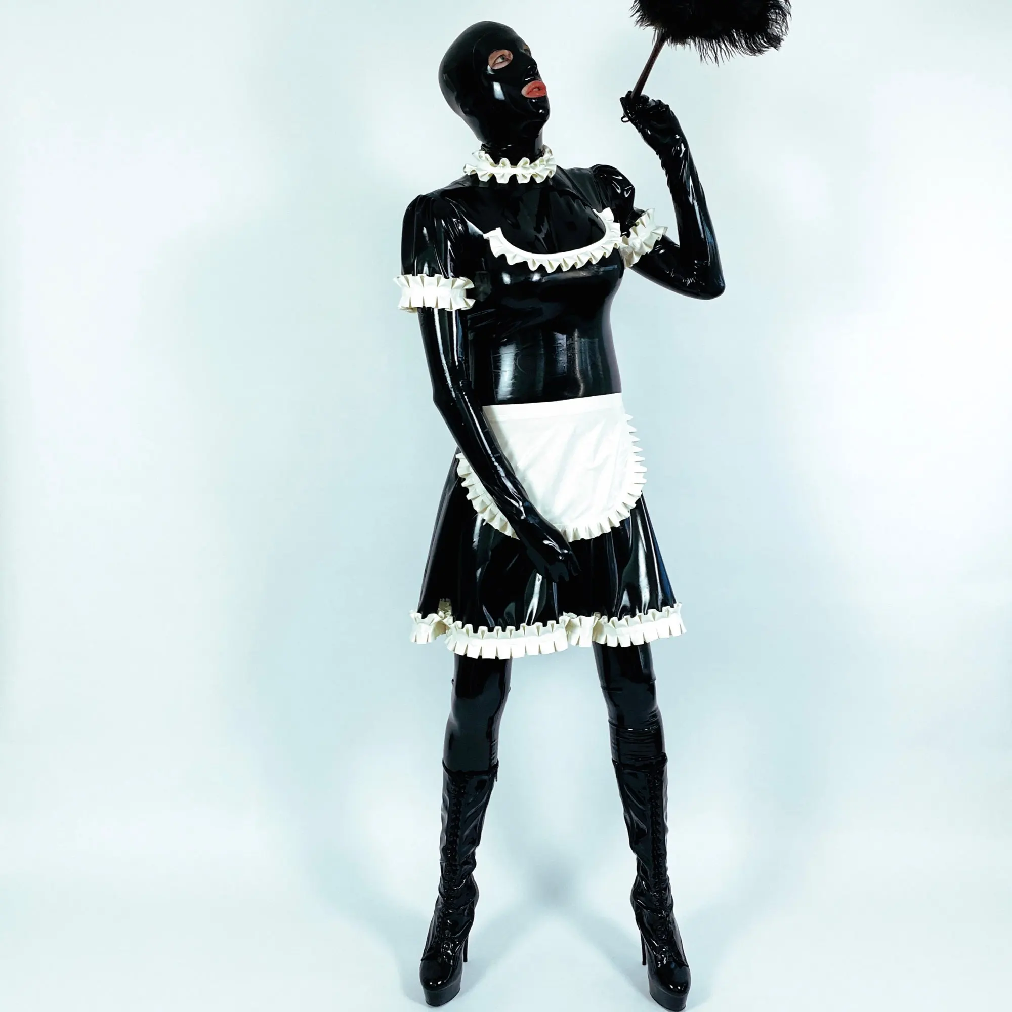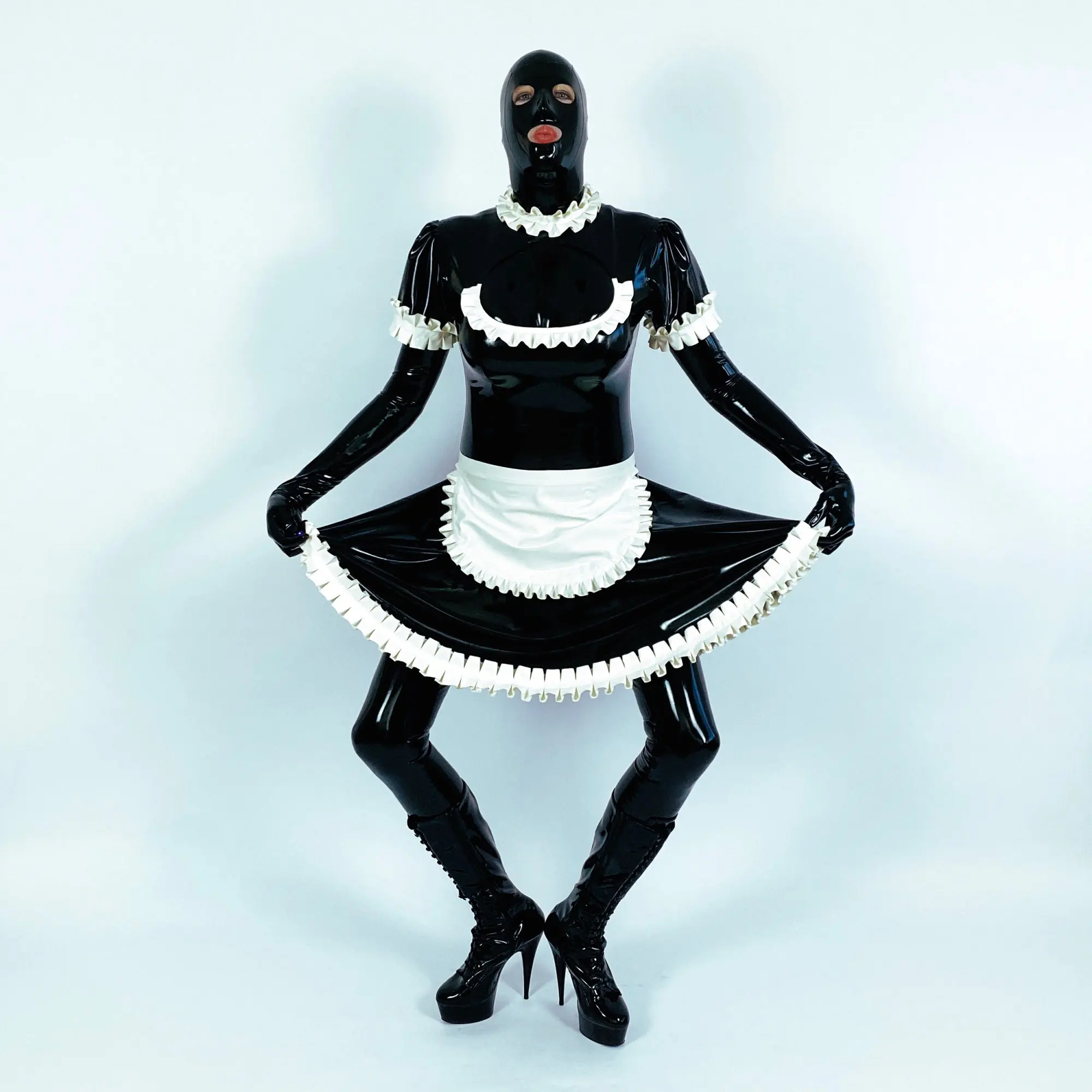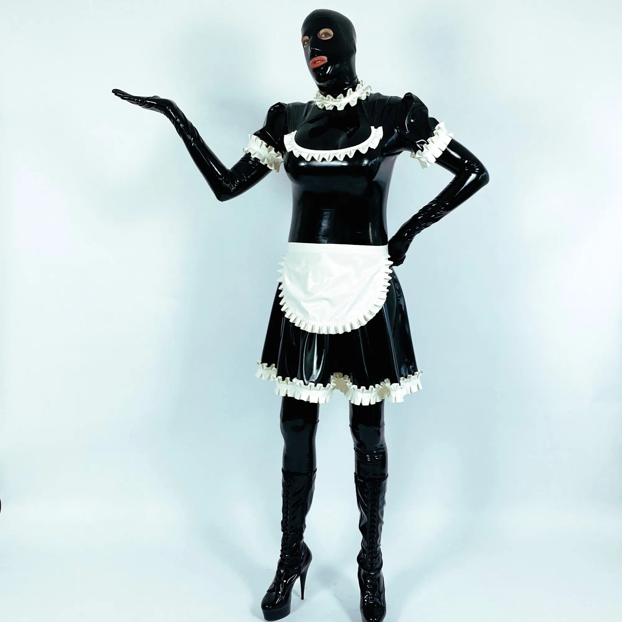Red With White Sexy French Maid Latex Dress With Apron High Collar Zipper Back Rubber Dress Uniform Playsuit Bodycon LYQ-0125