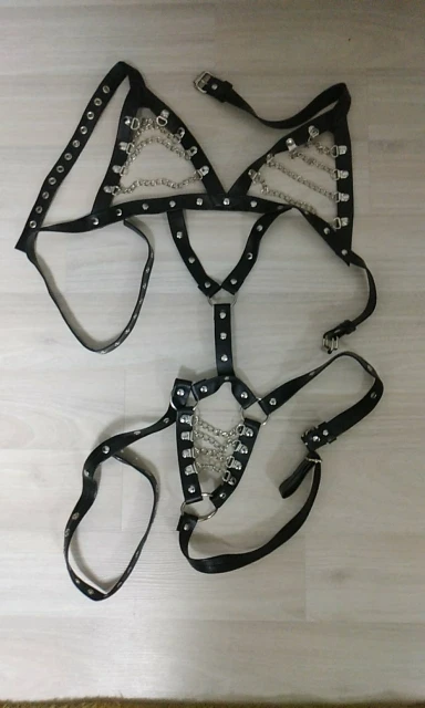 Sexy Leather Strap Body Harness Halter Teddies with Metal Chained Bra and Crotch Fetish Bodysuit Costume Kinky