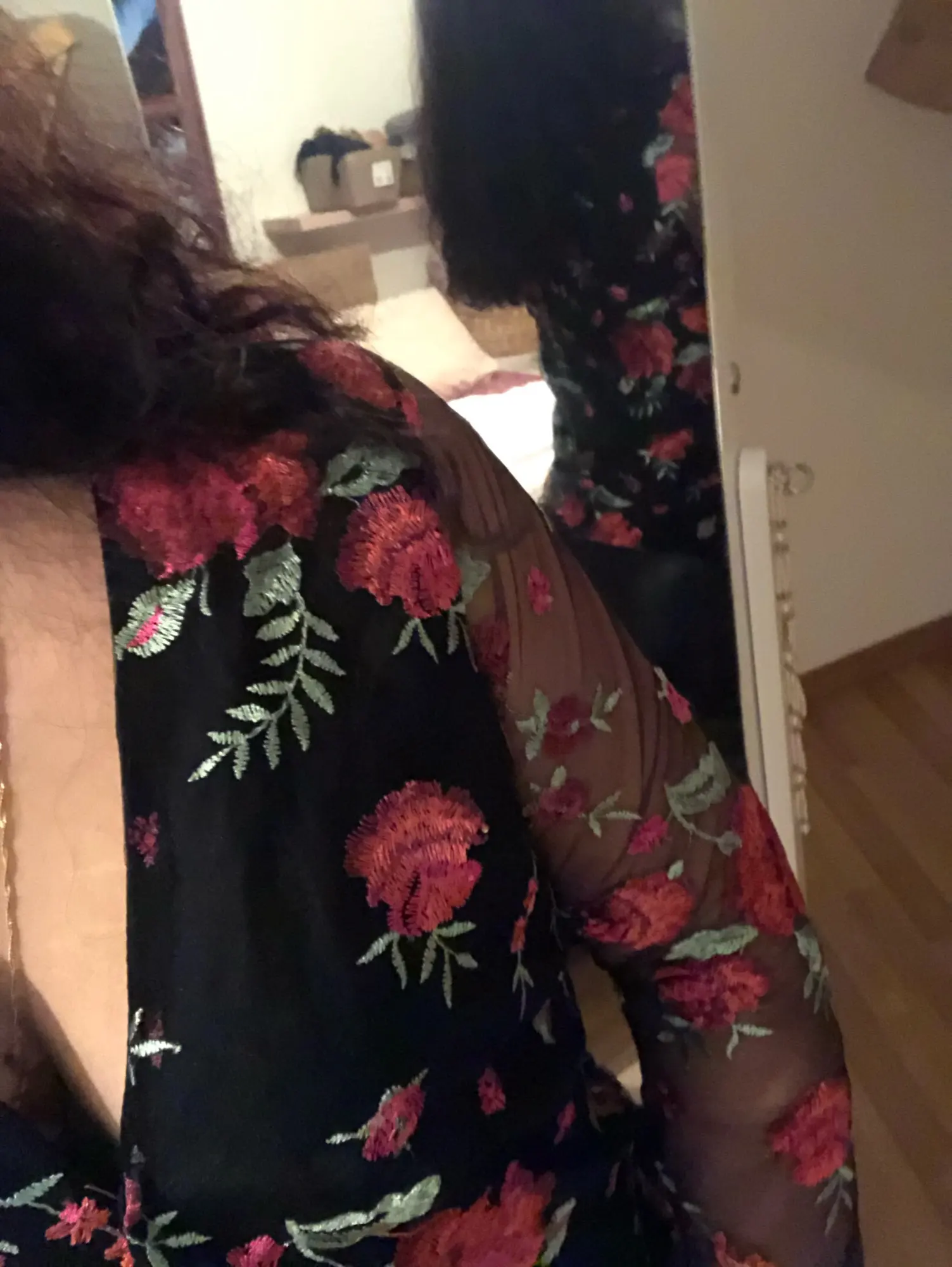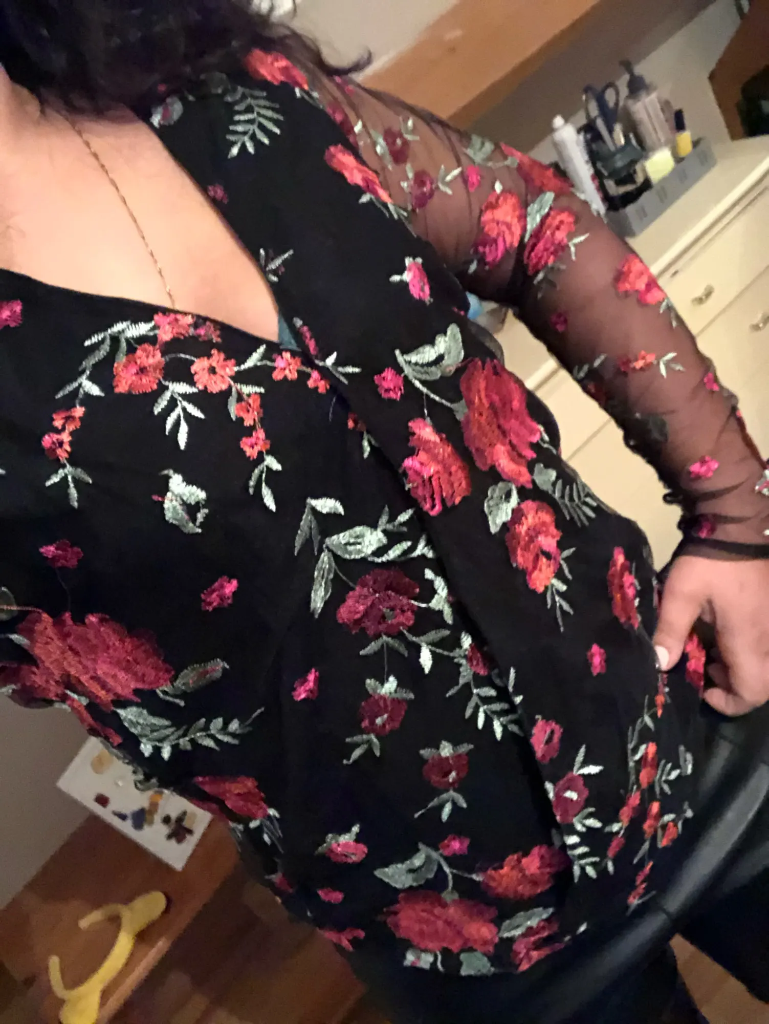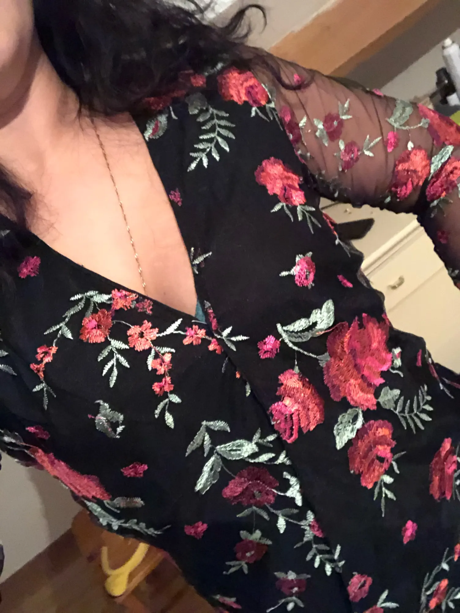 Sheer Mesh Floral Embroidery Blouse Women Deep V Neck Long Sleeve Casual Blouse Tops Streetwear