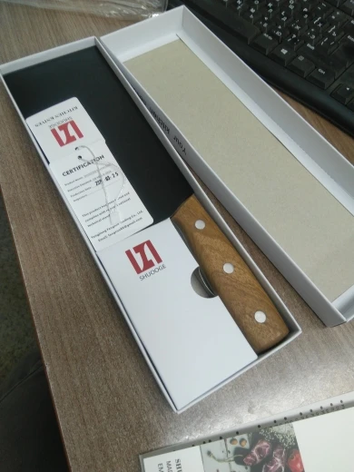 Razor-sharp out of the box, extremely good to handle. This is my new favourite kitchen knife!
