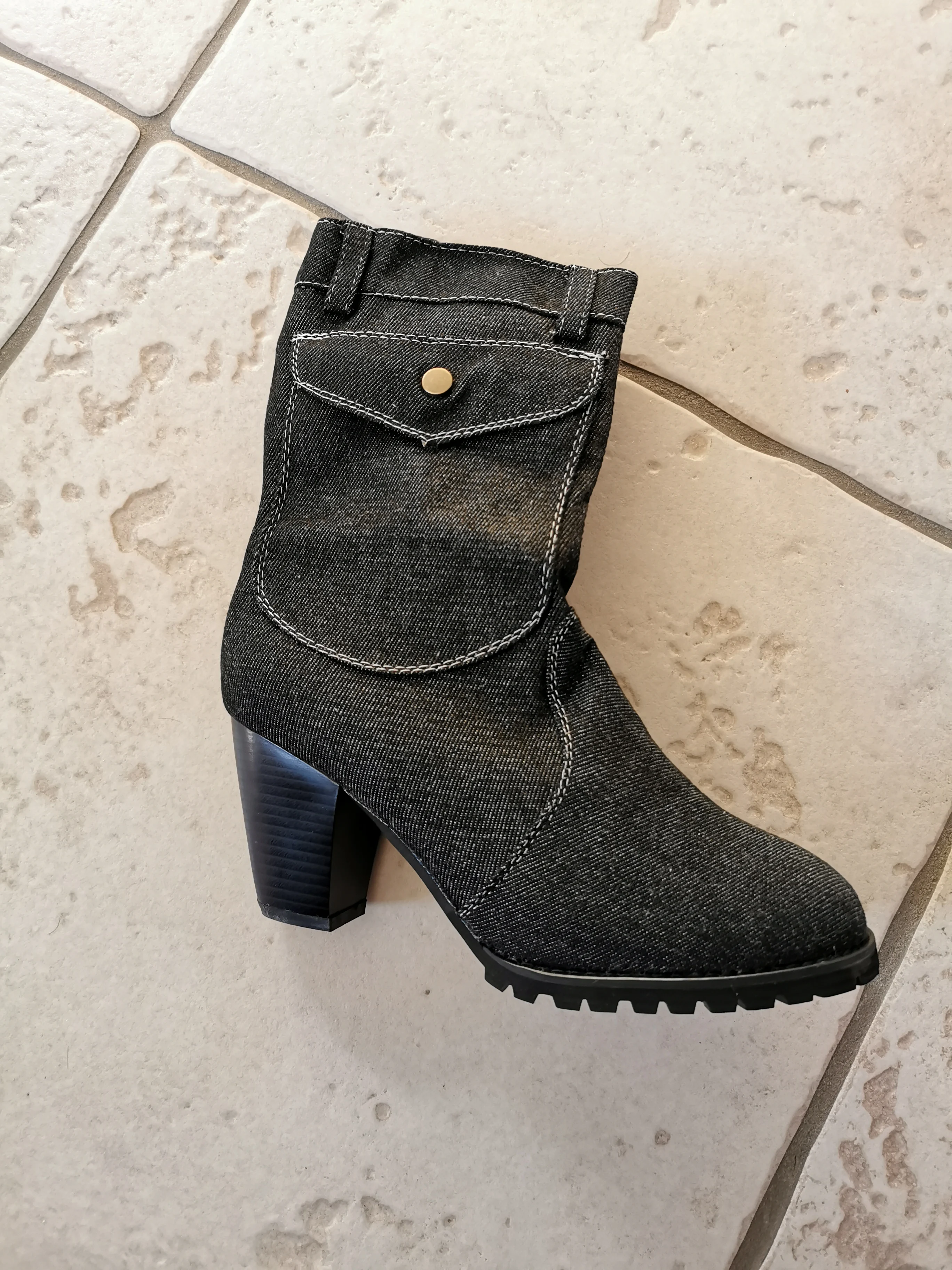 Spring autumn Denim boots for Women Mid-rise Solid color Large Size Shoes woman Slip-On Chunky Med Heels Mid-calf Boots
