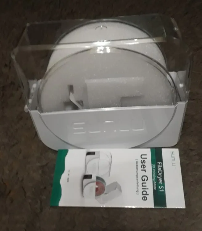 Very nice box, works well. Other complain no room for dryer material, but they fit perfectly in the center as the roll rolls on the outer edge. Very good product and arrived well packaged and working right out of the box. Simple user interface, did not need a manual. Your prints will improve!