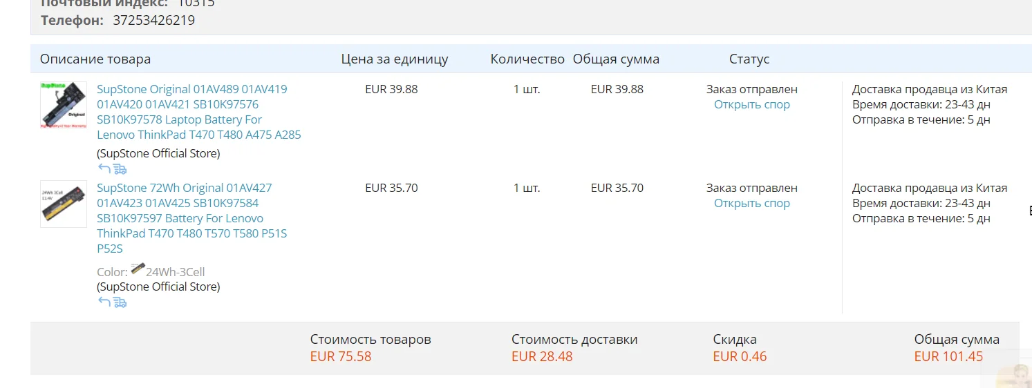 SupStone 72Wh Original 01AV427 01AV423 01AV425 SB10K97584 SB10K97597 Battery For Lenovo ThinkPad T470 T480 T570 T580 T440S P52S