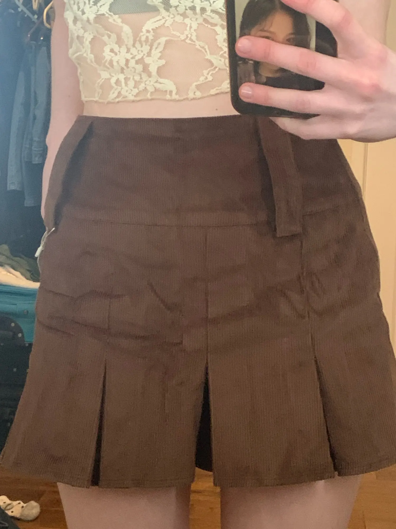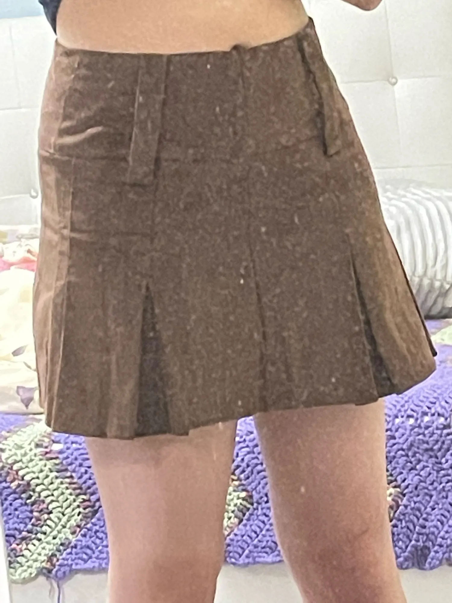 skirt is very cute but i have small waist so had to use a belt. i recommend! it came quickly to uk <3 nice material and clear pleats
