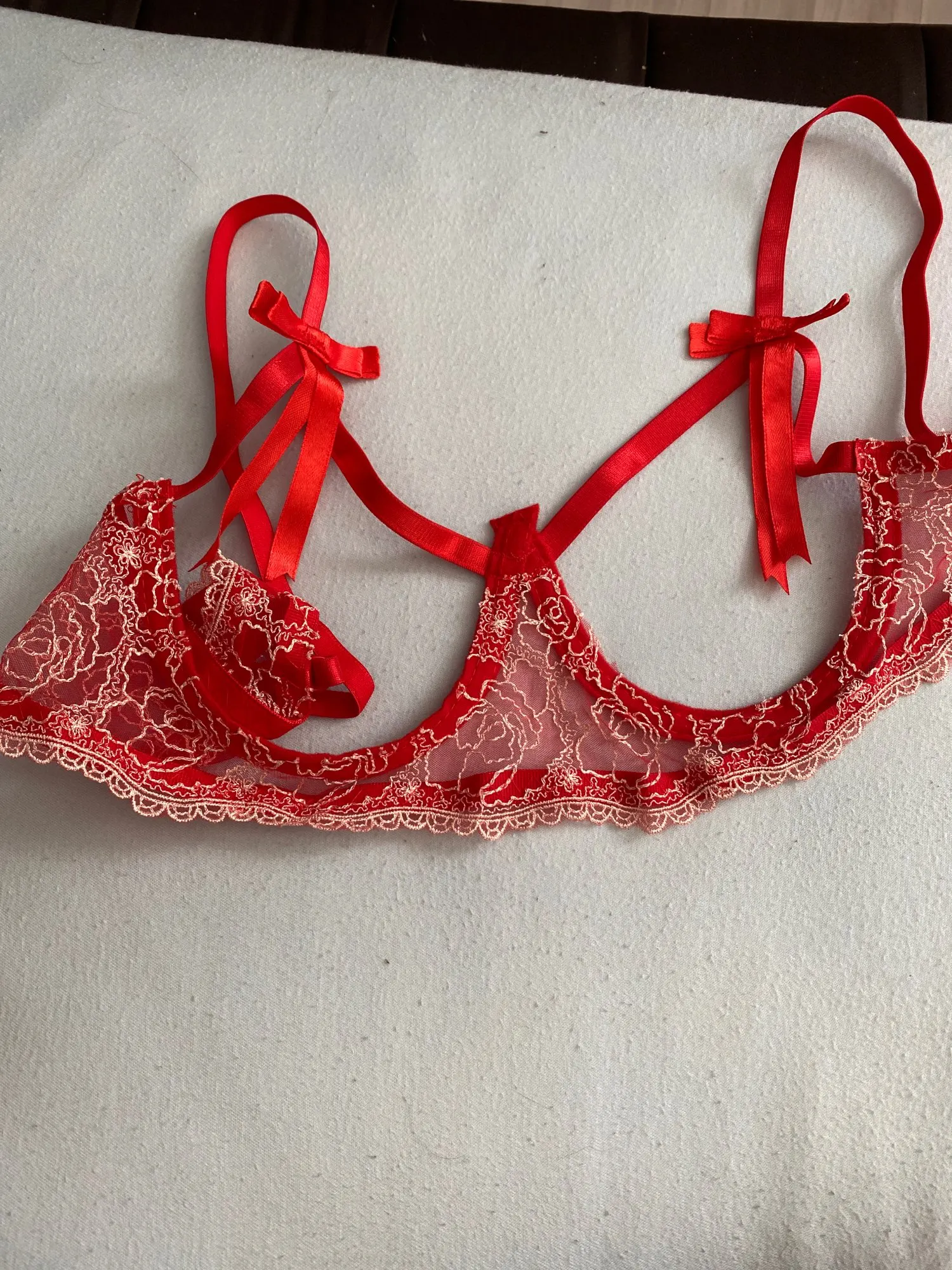 Reb brad and thong, ok, but it was sended without nipple shields :( Las bragas y sujetador son aceptables pero se envio sin pezoneras. :(